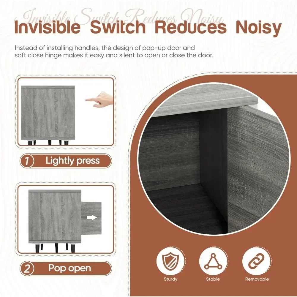 Pop-up Door: The TV stand adopts pop-up doors instead of handles, so that it looks very neat. And there are soft close hinges behind the door, which makes it silent and safe for hand to close.