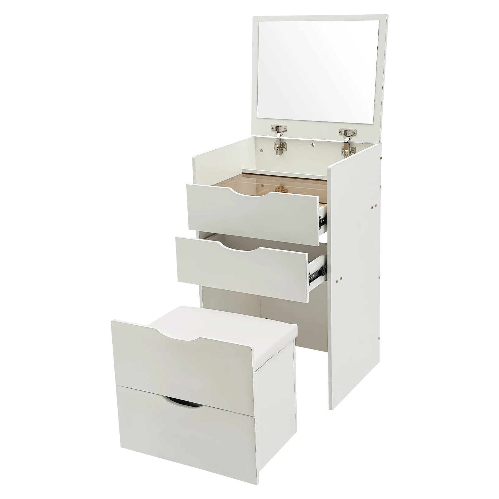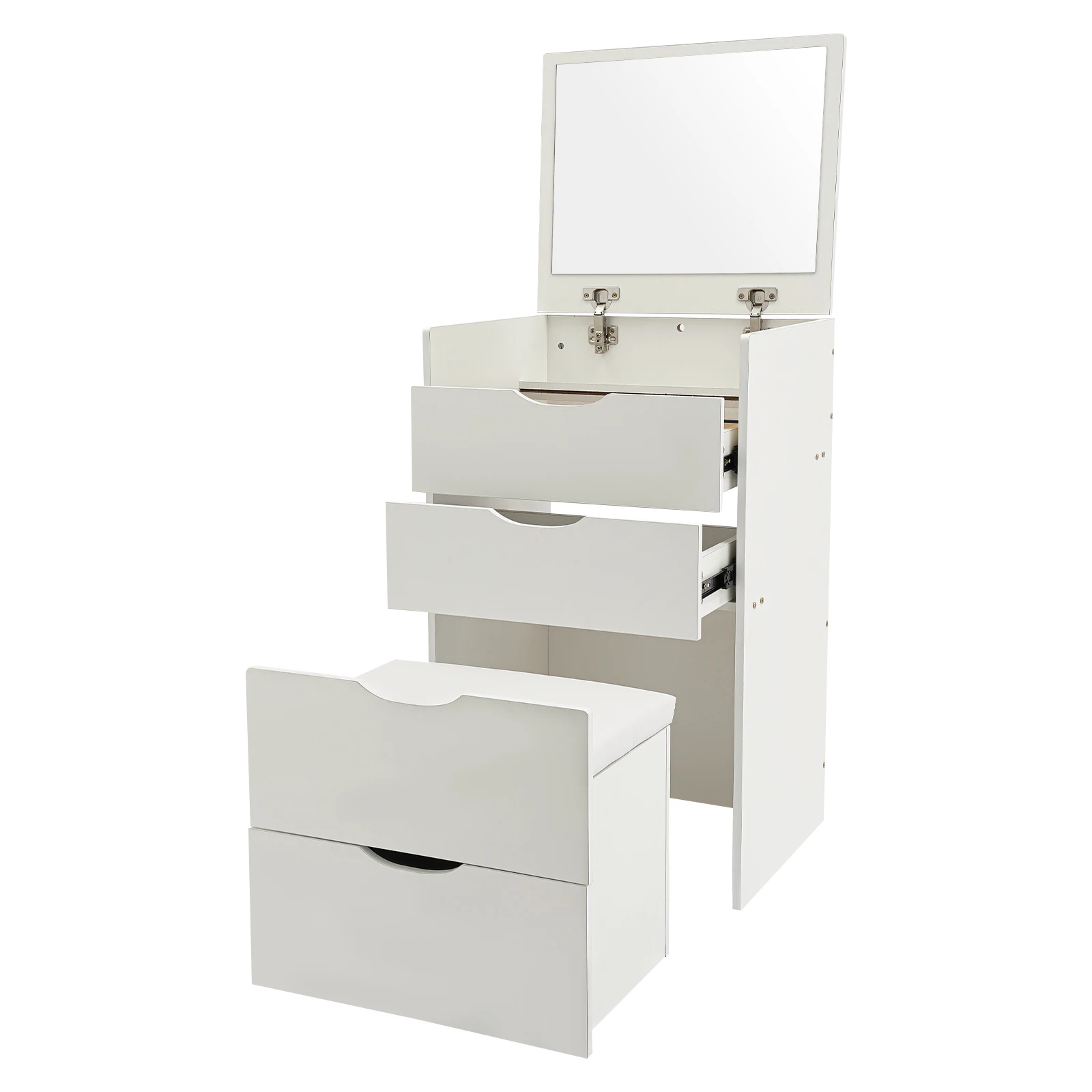 User Friendly: The top mirror panel can be flipped up and closed together, making it not only a makeup vanity but also a bedside table. Additionally, the soft vanity stool can hold up to 220lbs for comfort and peace of mind.