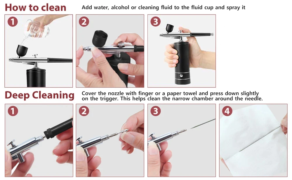 【0.3 mm Fluid Nozzle】This nail airbrush features a 0.3 mm nozzle combination for better control of paint and airflow, reducing overspray, improving precision application, and preventing paint waste. Note: All paint must be diluted! 【Easy to Clean】This airbrush painting tool comes with two paint cups of different capacities (20 cm and 40 cm). The unique funnel shape facilitates smooth paint flow and is easy to clean with a brush, making it ideal for both beginners and experienced painters.