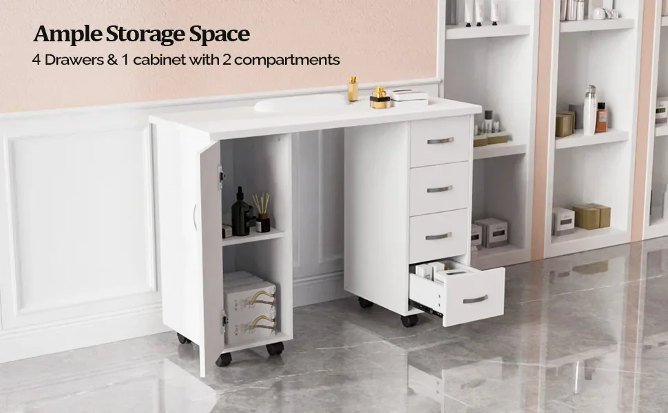 - FAIR STORAGE SPACE: The wooden manicure table is designed with 1 side cabinet with two compartments and 4 drawers, which provides you with space for storing your nail polishes or other nail tools.