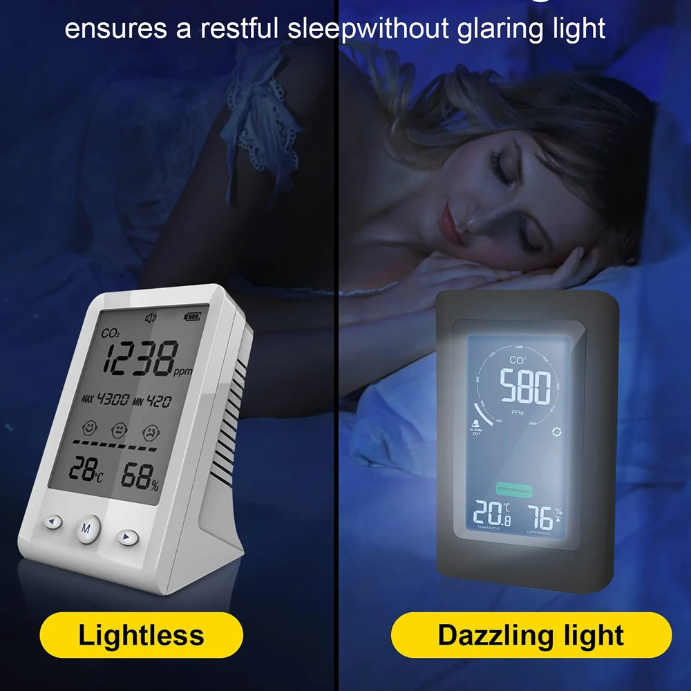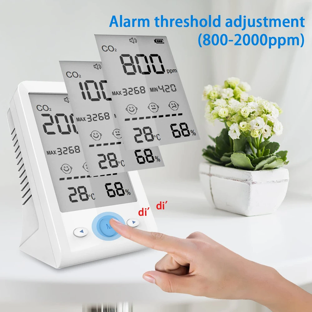 3. Simple & Fast Setup. No complicated app or Wi-Fi required. The alarm threshold can be adjusted between 800 and 2000ppm by double clicking "M". If the CO2 concentration exceeds the set alarm value (default setting is 1000ppm), an alarm will be issued immediately.