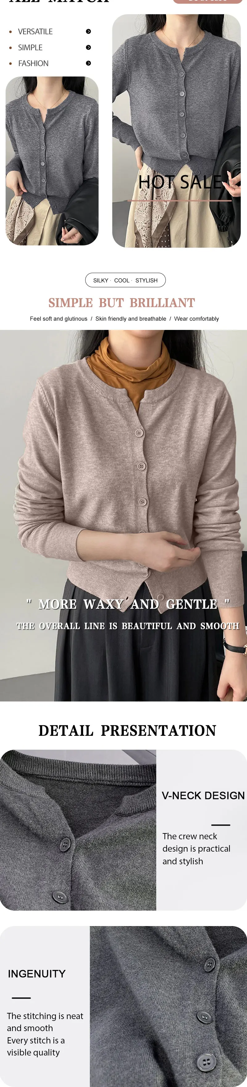 Solid color cardigan with its simple design style, can easily match a variety of clothing, whether it is skirts or pants, can show the charm of elegance and fashion. Whether it is daily leisure or workplace wear, it can be easily controlled and show the unique taste of women.