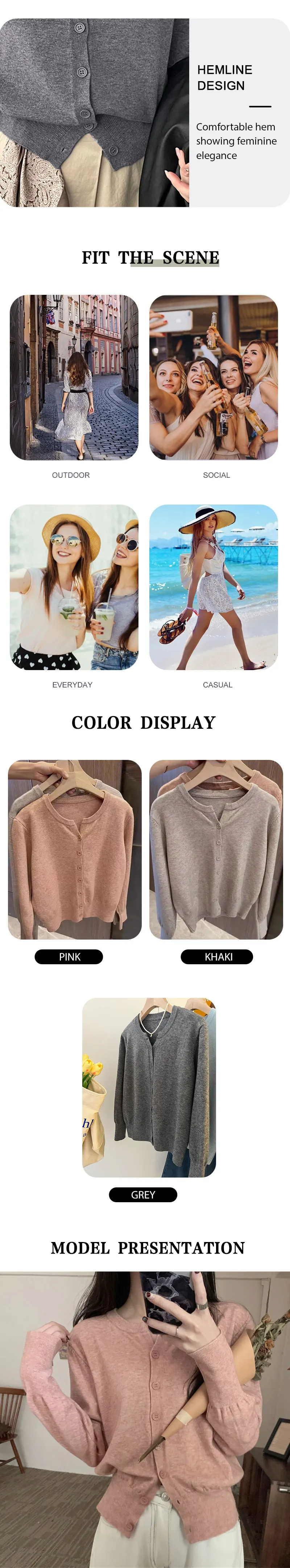 The use of high-quality fabrics, such as soft and comfortable knitted fabrics, making cardigan both warm and breathable. At the same time, exquisite workmanship and meticulous stitching make wearing more comfortable and natural, not easy to deform or pilling.