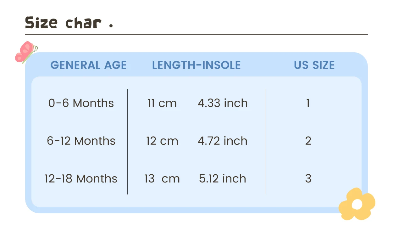 12-18Months       13cm/5.12″      6.0cm/2.36″       3