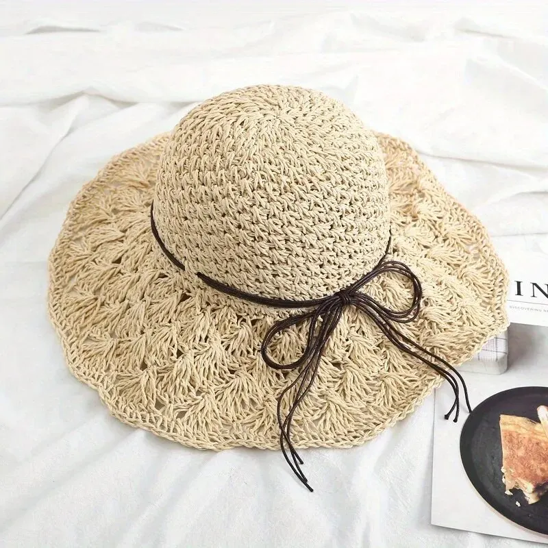 New Women Casual Travel Supply Sun Protection Beach Hat Raffia Straw Hat Bowknot Rope Decoration Straw Hat
