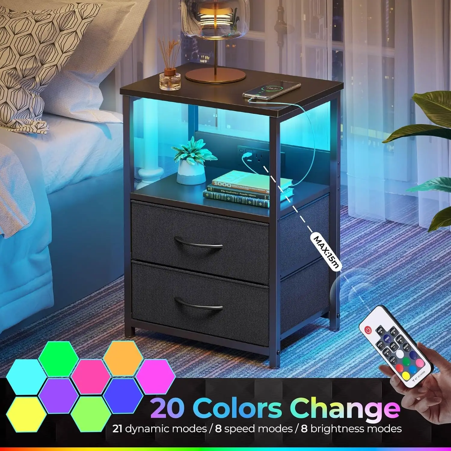 Nightstand with Charging Station, Bedside Table with LED Lights, Night Stand with 2 Fabric Drawers, 3-Tier Storage End Table for Bedroom, Black