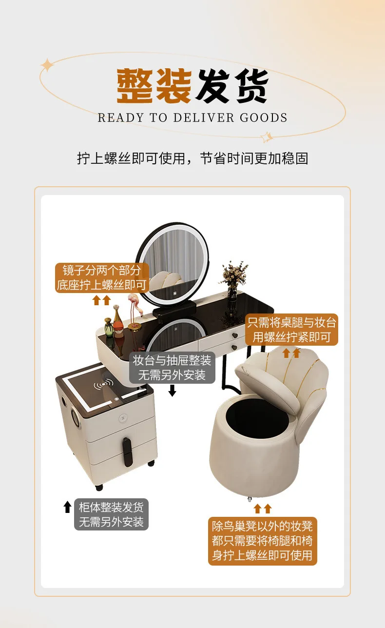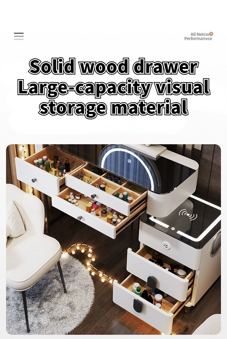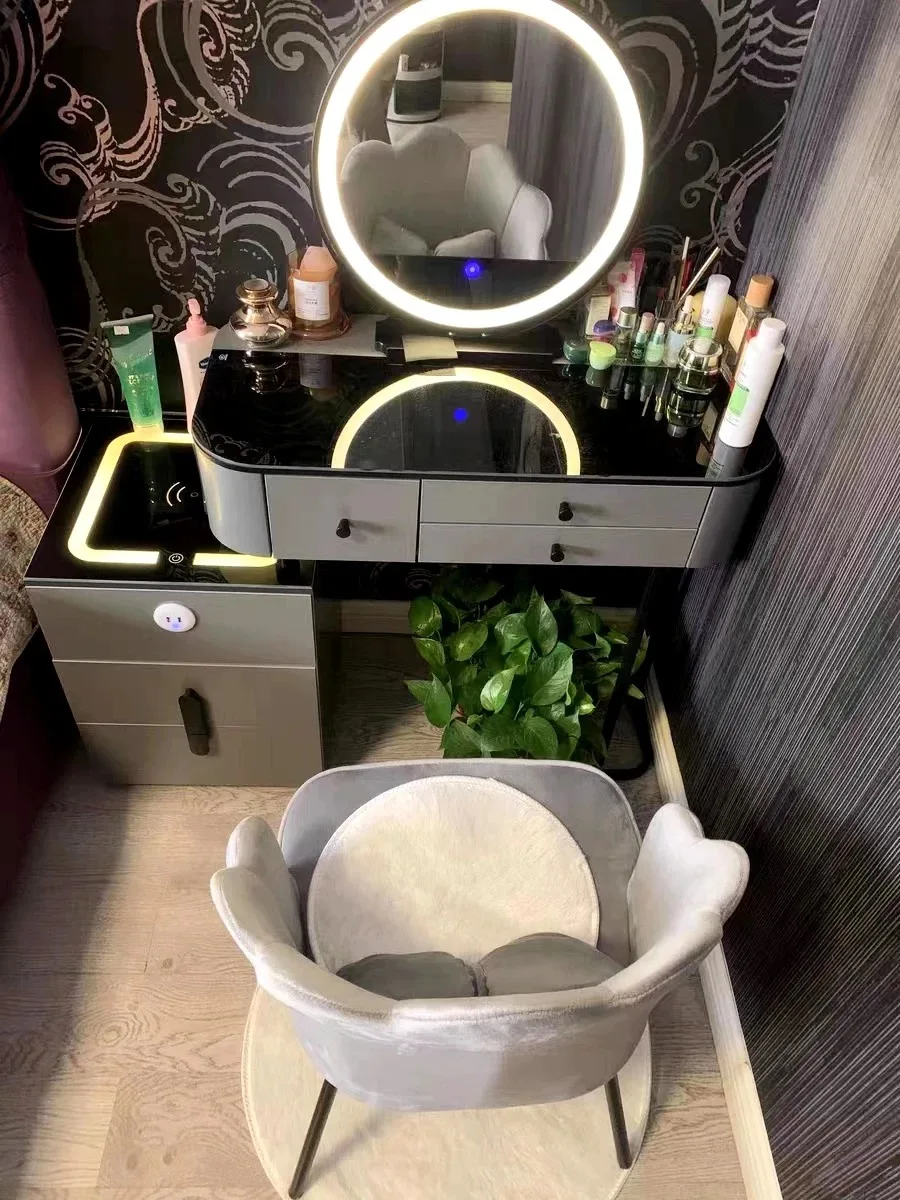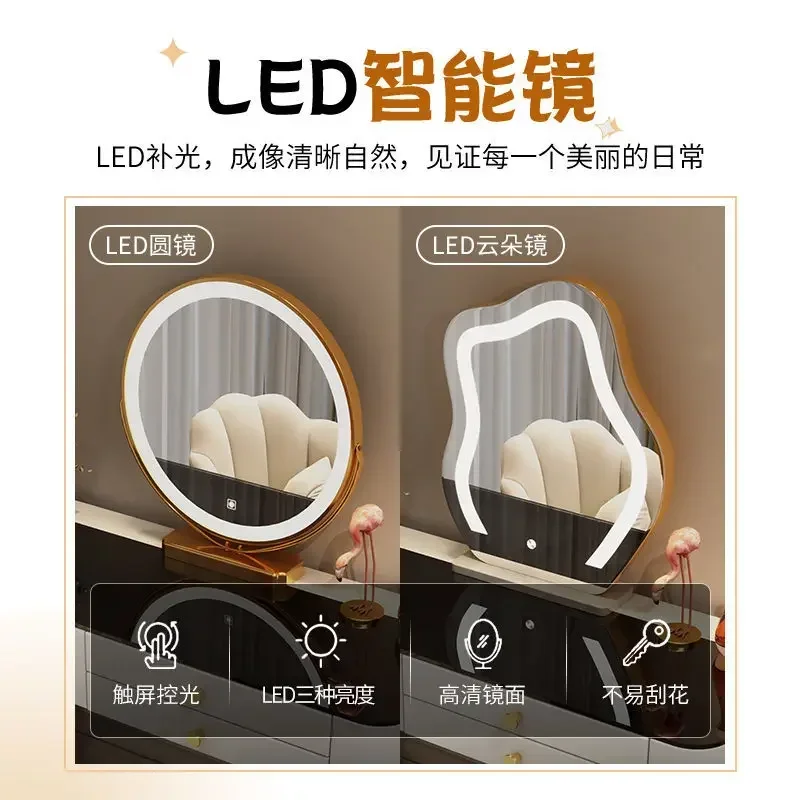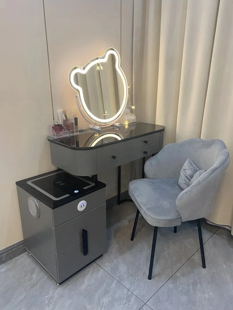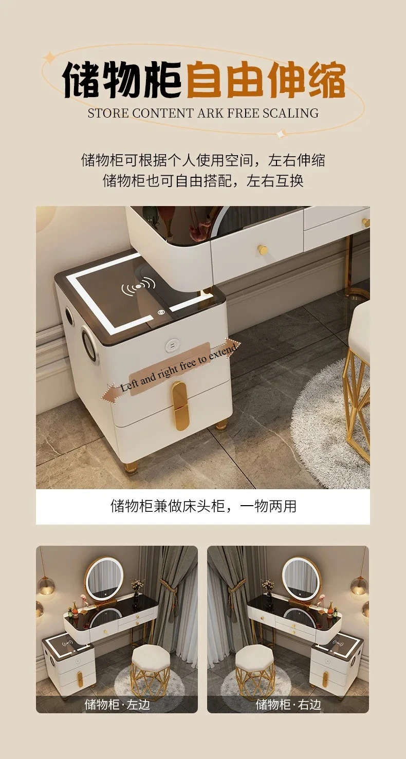 Nordic Glass Luxury Dressing Table with Smart Wireless Charging Bedroom Vanity Nightstand Makeup Table with Cloud Mirror Dresser