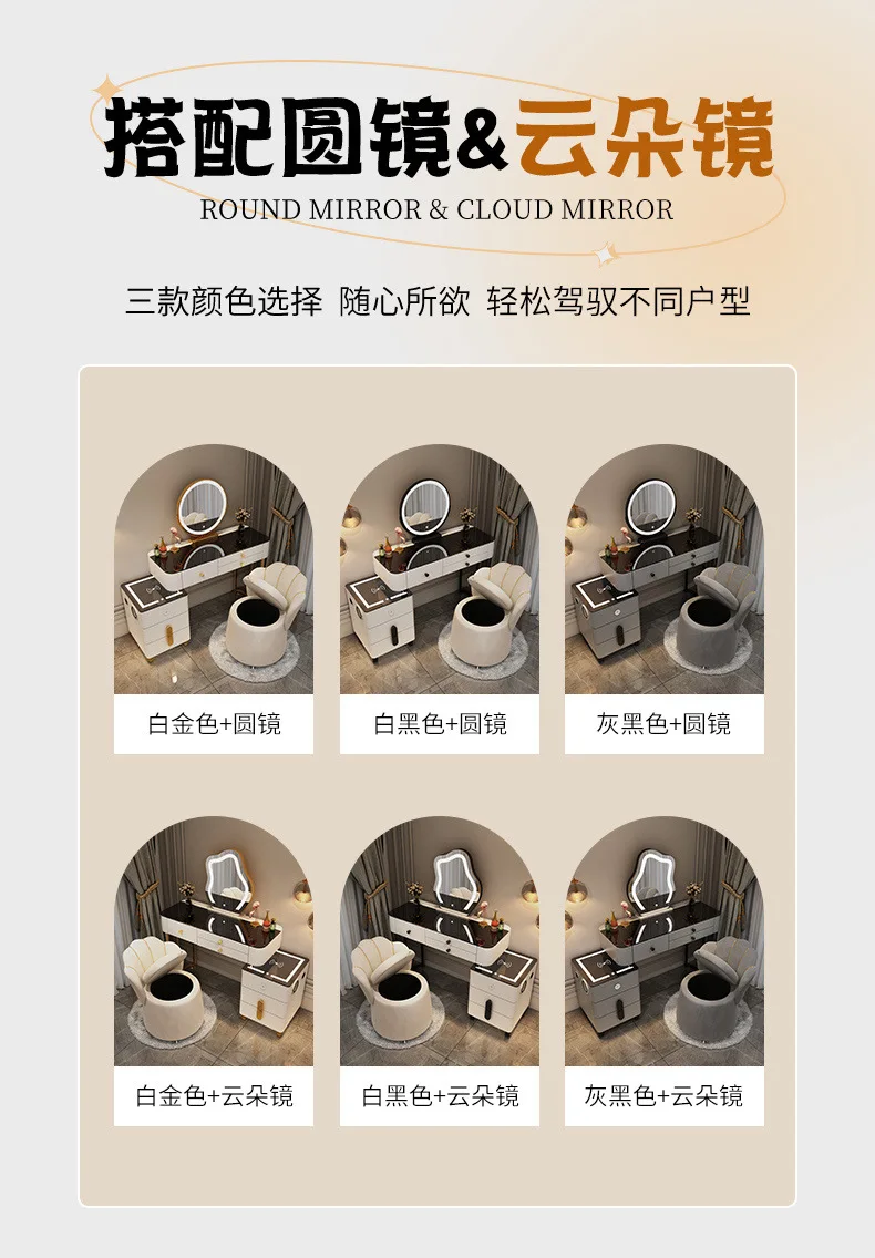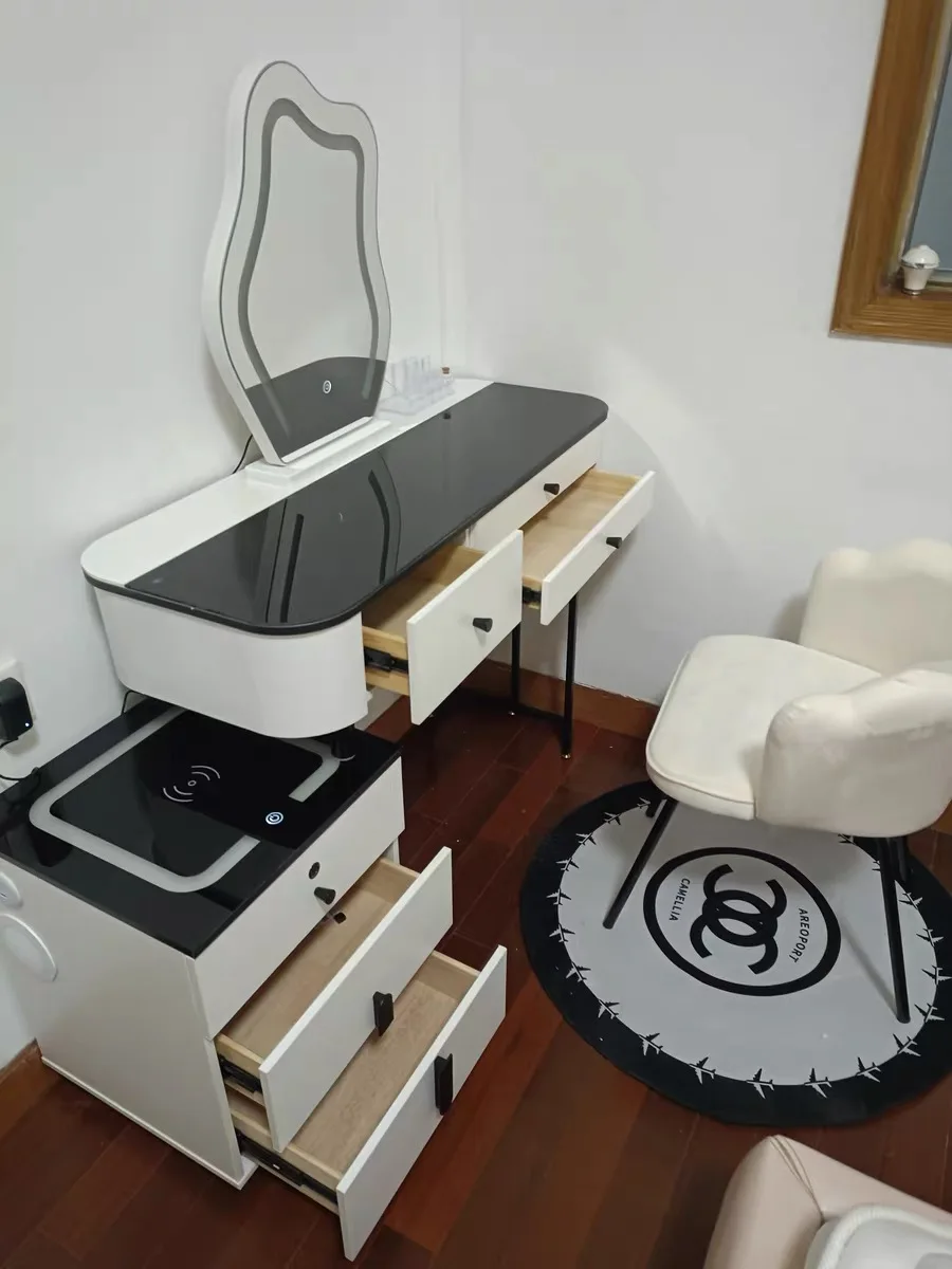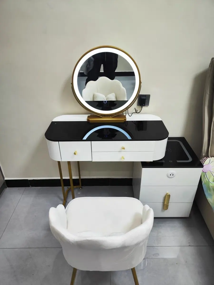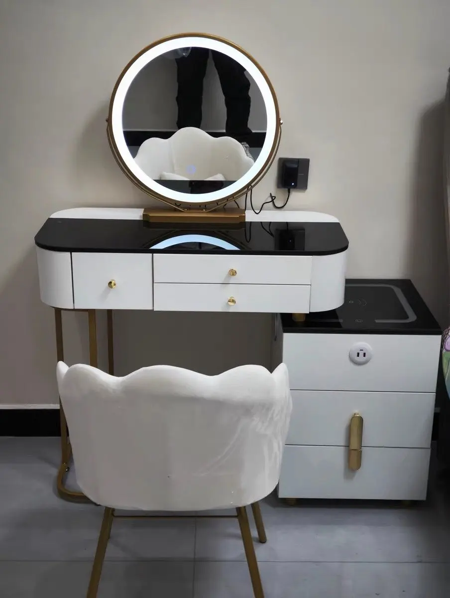10 reviews for Nordic Glass Luxury Dressing Table with Smart Wireless Charging Bedroom Vanity Nightstand Makeup Table with Cloud Mirror Dresser
