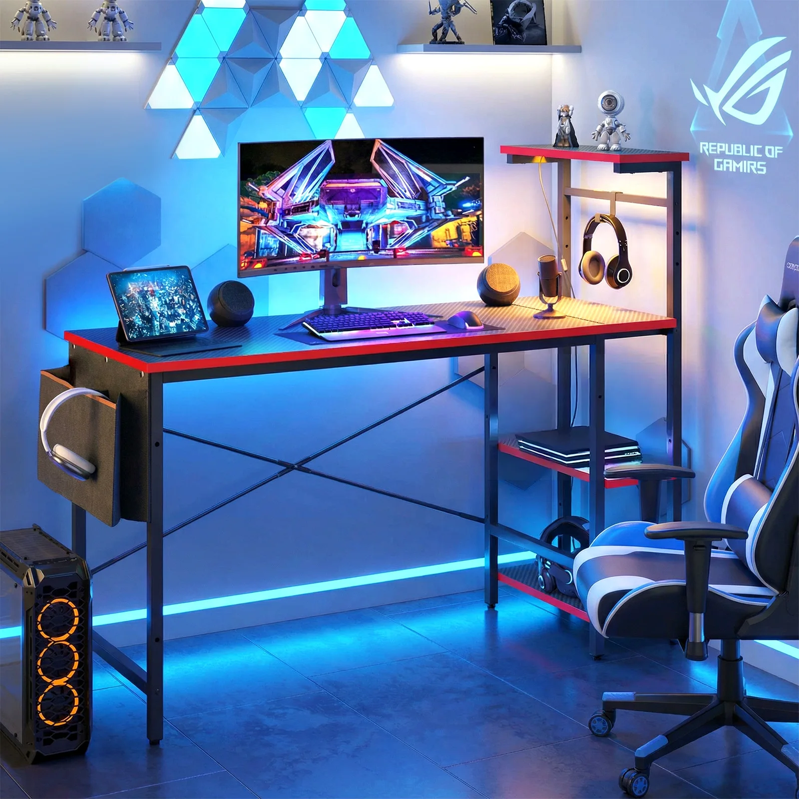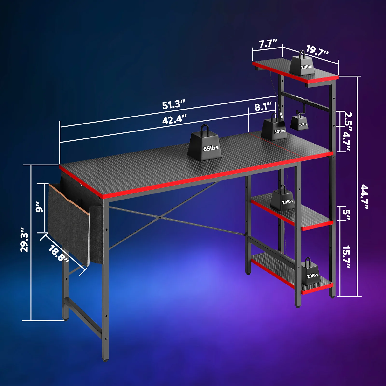 NOST&HOST 51.3″ Gaming Desk for PC/Computer with LED, 4 Tiers, Storage, Hooks & Adjustable Shelf (Black Carbon Fiber)