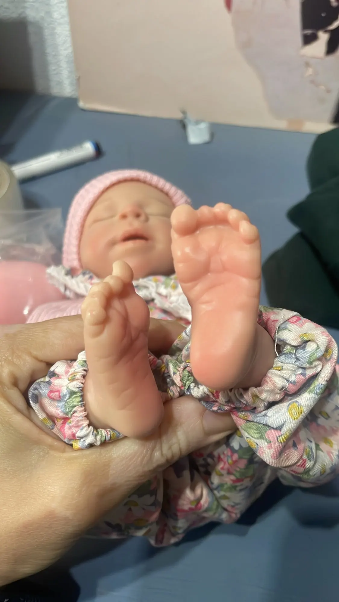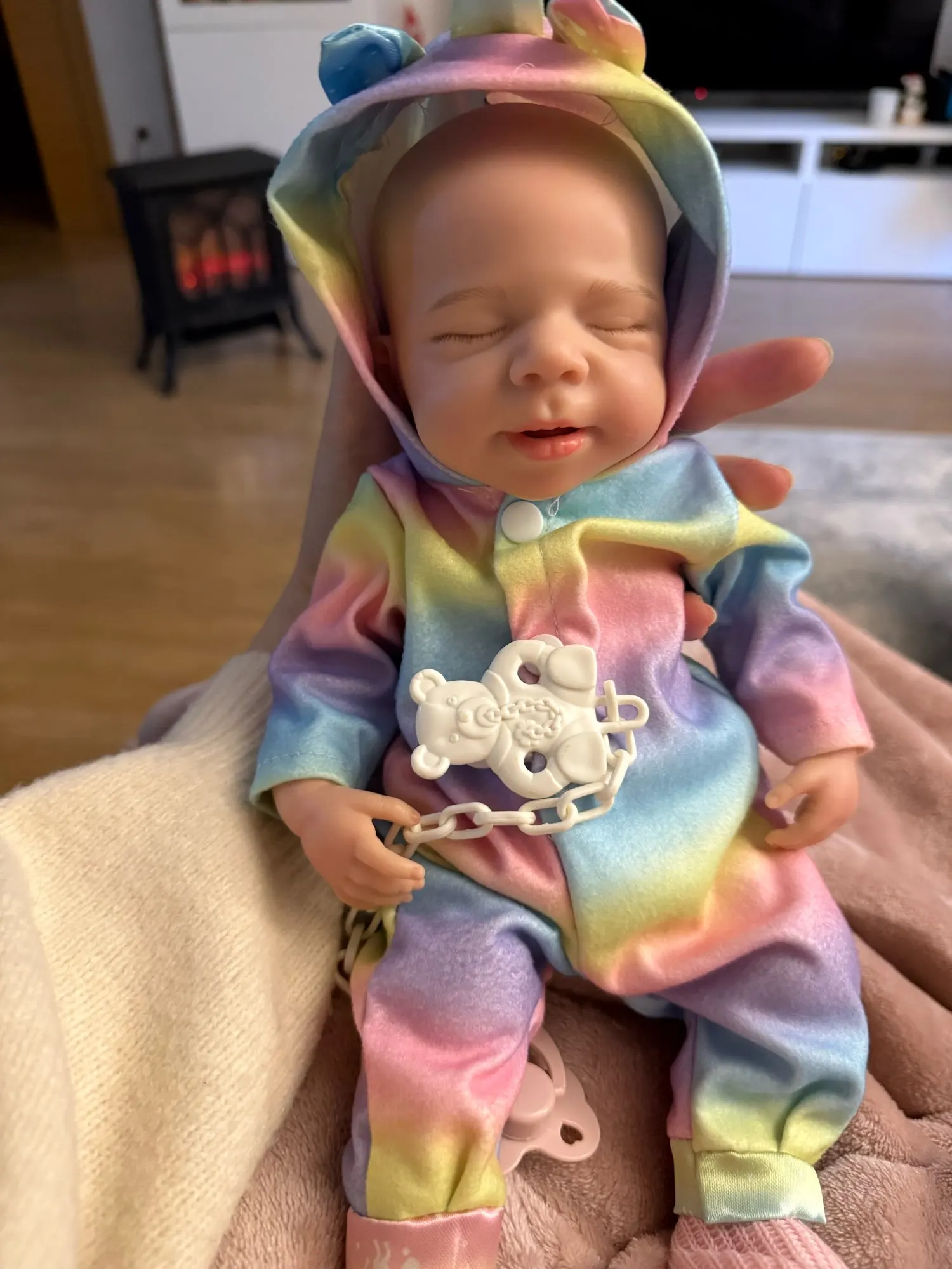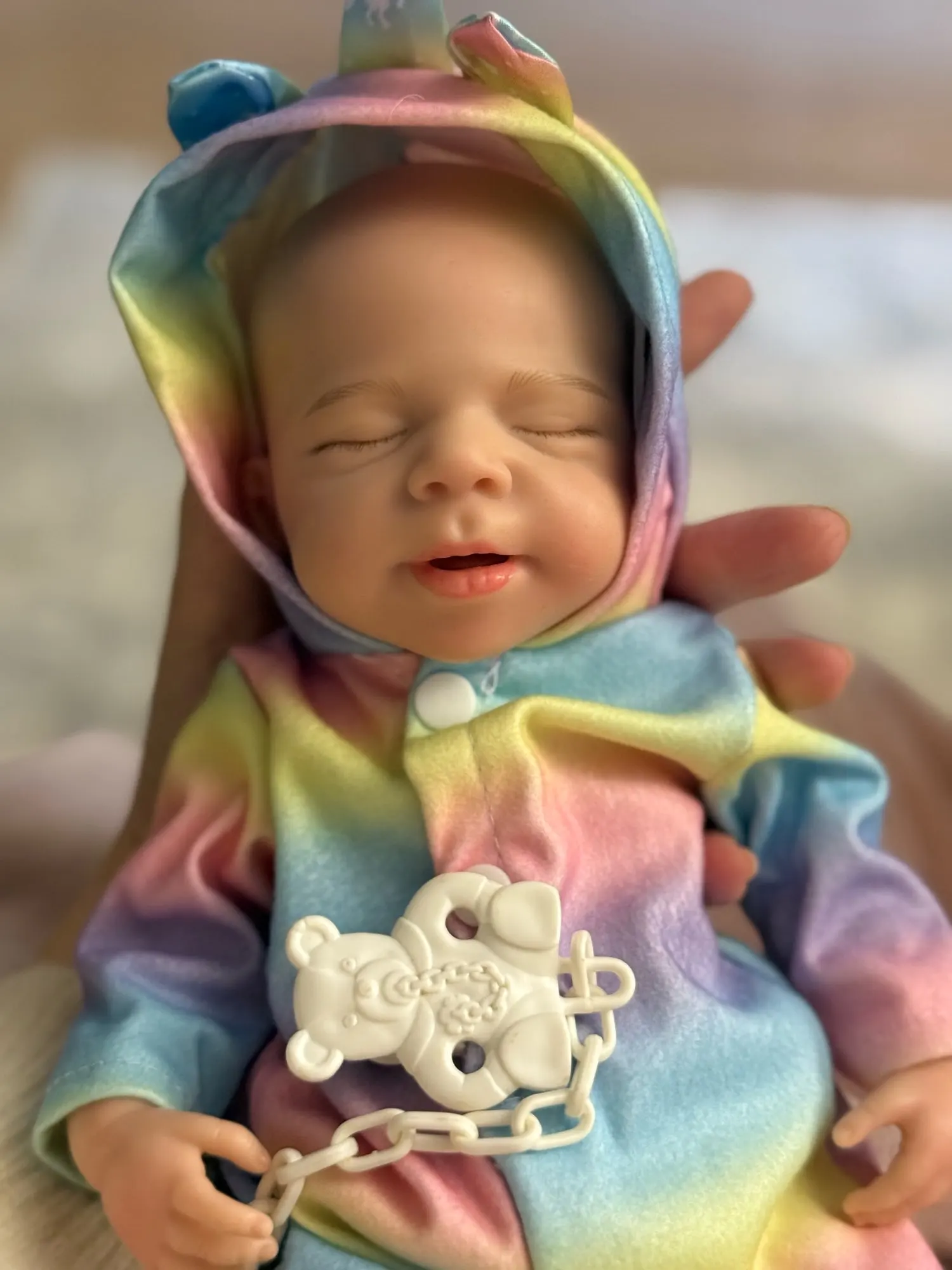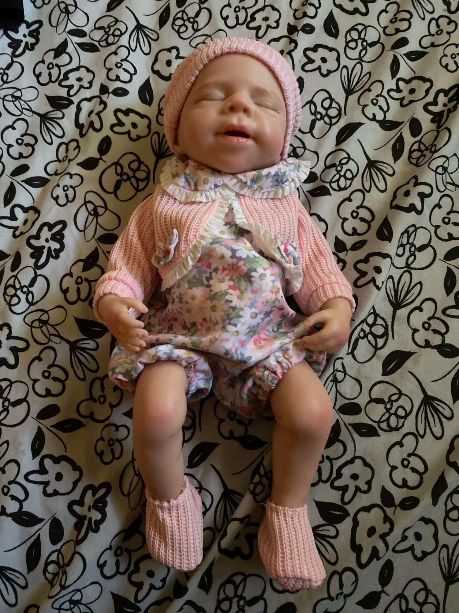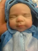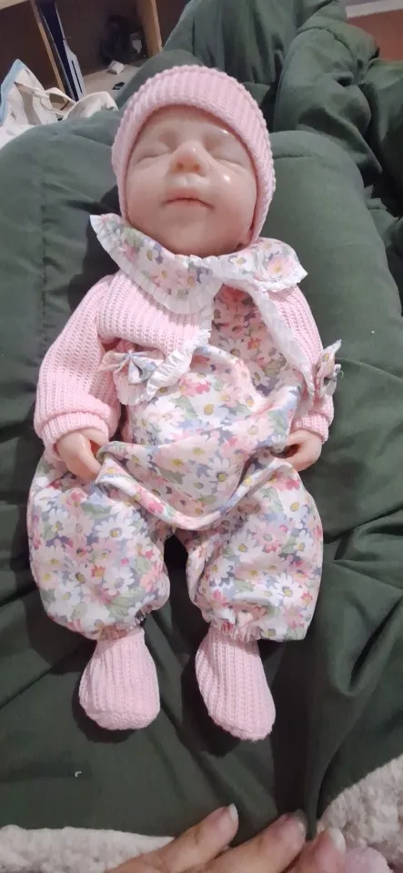 This is the reborn doll i received she is beautiful and i really like her. She came with a bottle, hat, socks, and a onesie. Her mouth does open but it is relatively small and she’s quite heavy and it only took five days to arrive but she is a little smaller than 13 inches