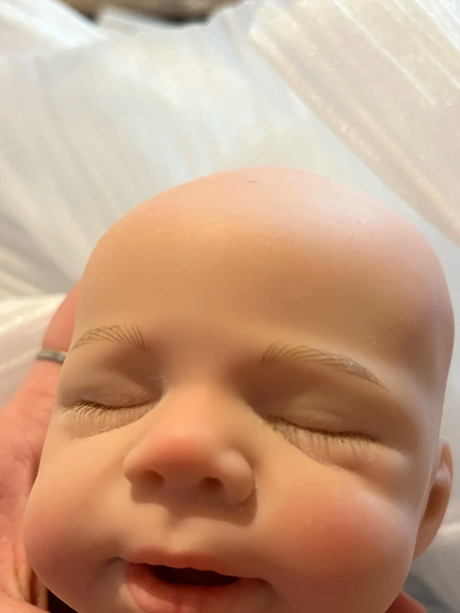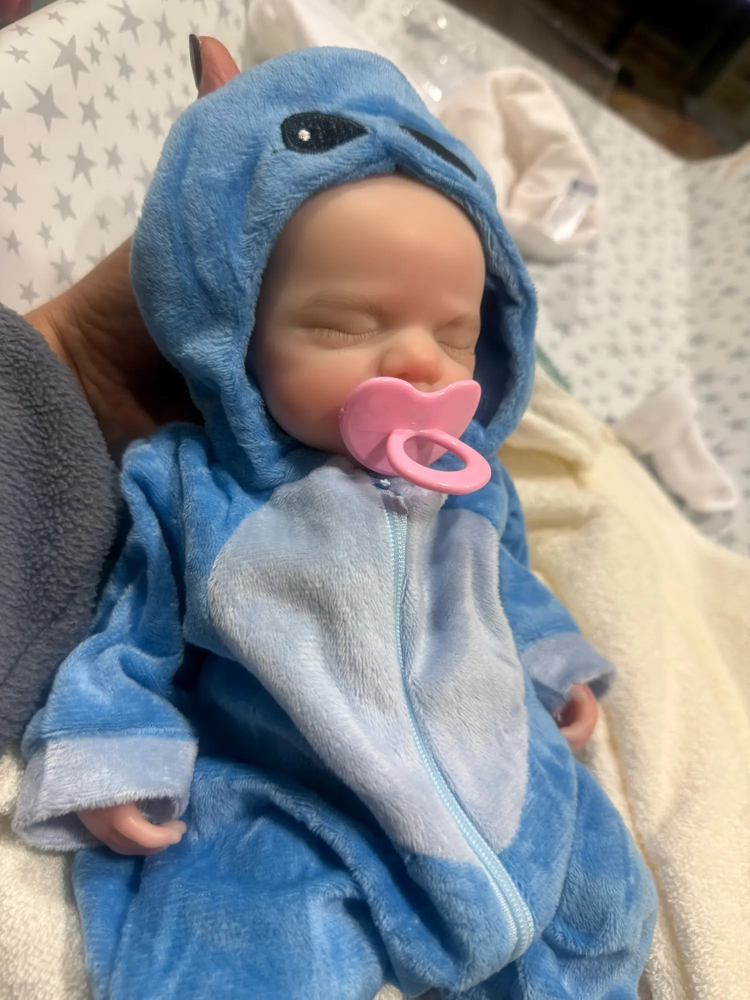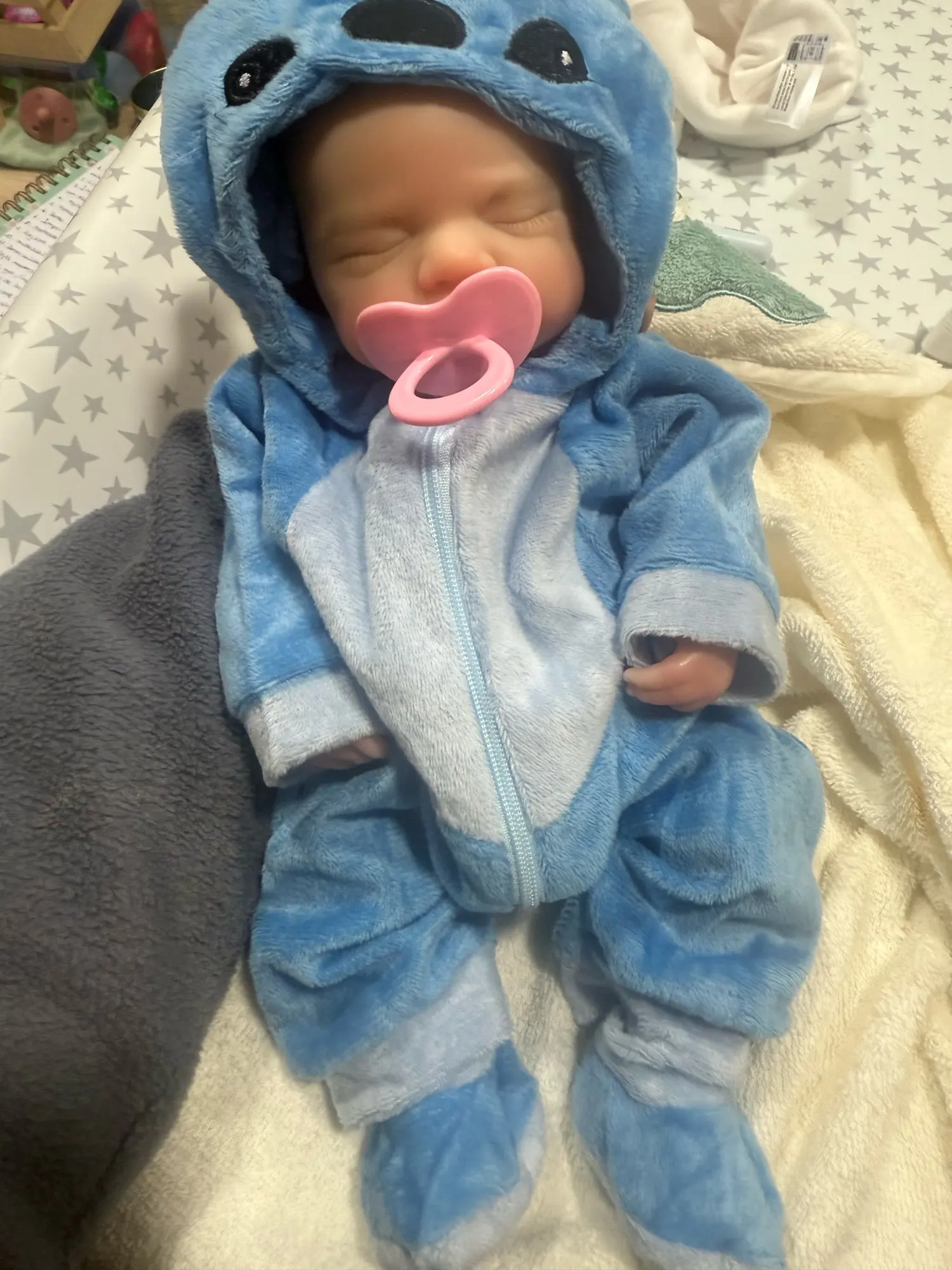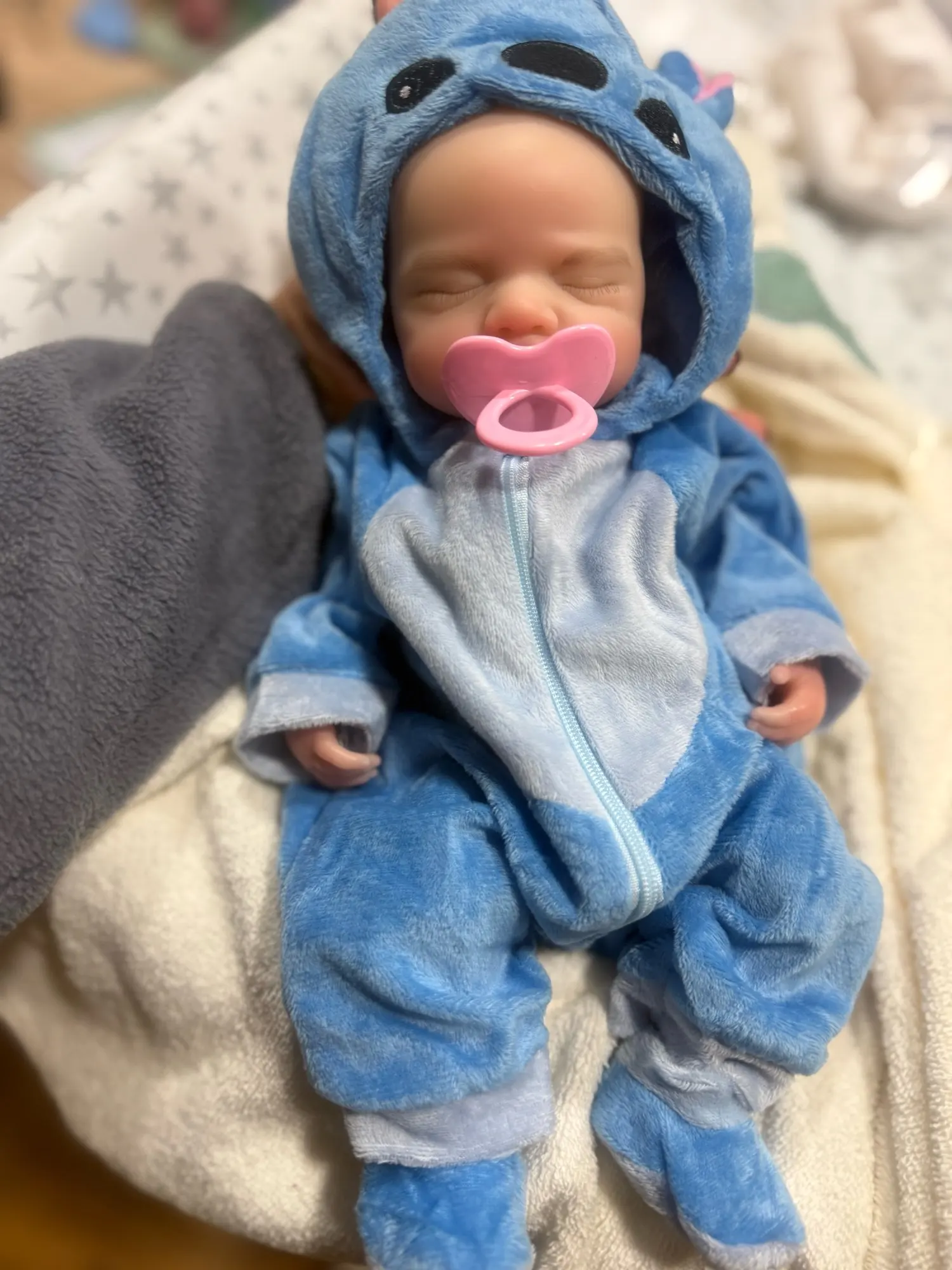 This is the reborn doll i received she is beautiful and i really like her. She came with a bottle, hat, socks, and a onesie. Her mouth does open but it is relatively small and she’s quite heavy and it only took five days to arrive but she is a little smaller than 13 inches