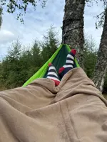 Nice portable hammock to take a moment to rest in. If it ’s a bit chilly outside, a blanket is recommended.