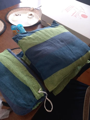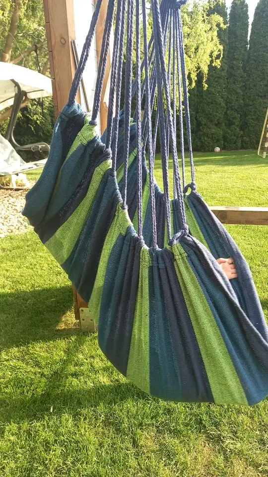 Very good fabric, strong, comes with everything you need to hang it just don’t recommend a high tree because then it’s too short.