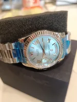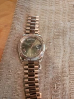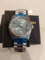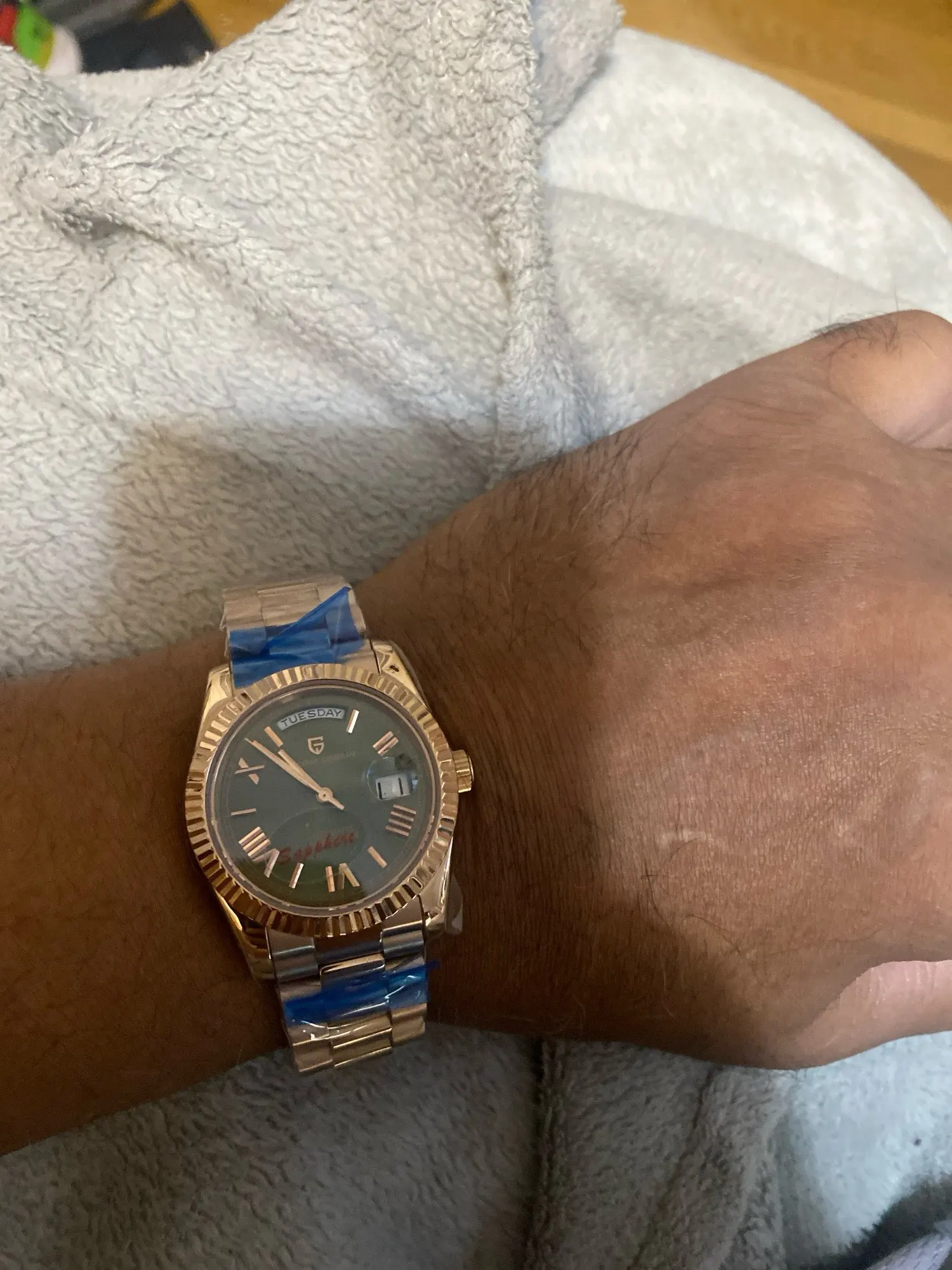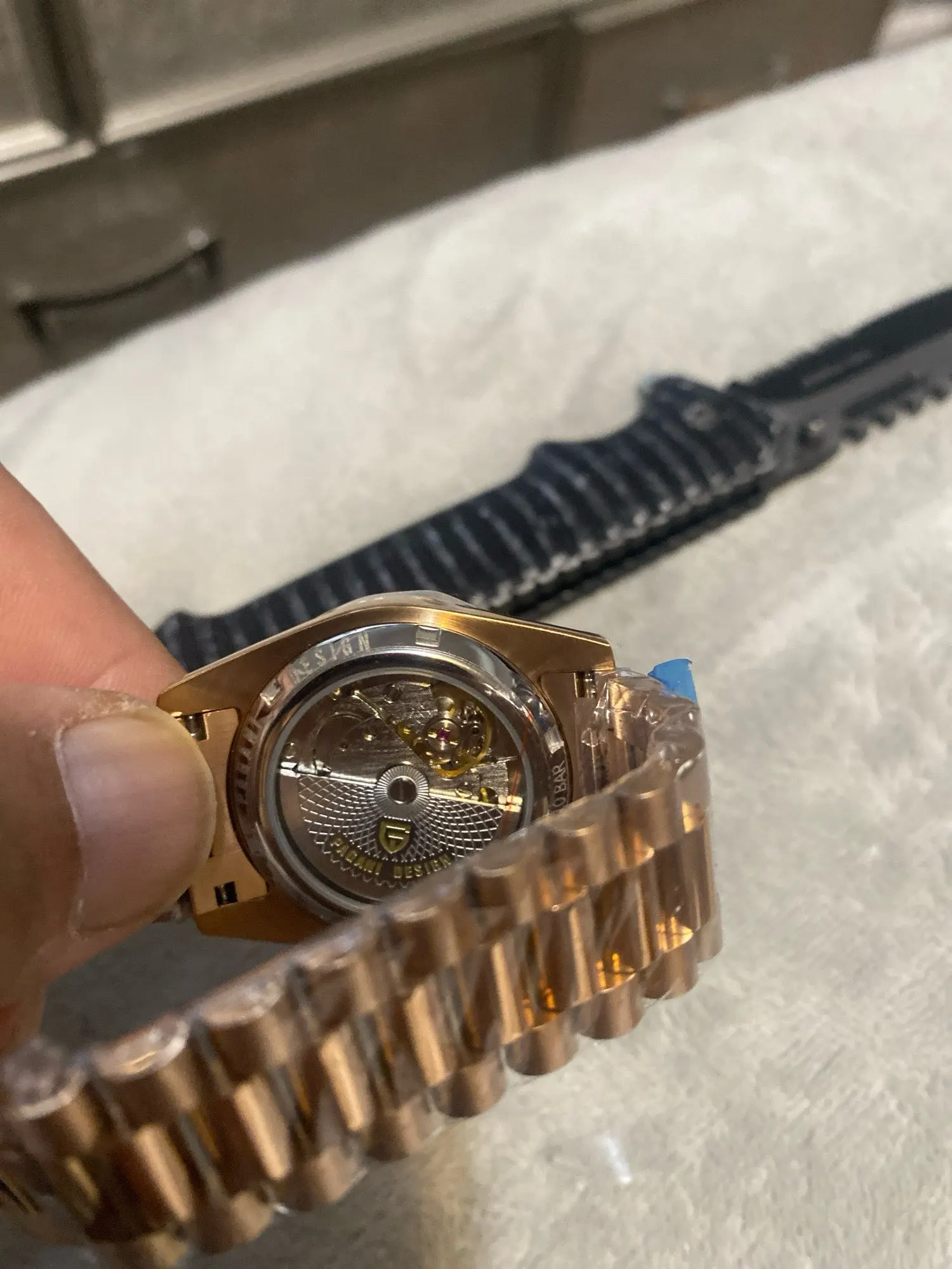The item came exceptionally fast to nyc because it was shipped from jersey. The watch is stunning in person the pictures doesn’t do it justice. I love the way the light dances off it just beautiful. The fact that i paid less!$50 for it should be a no brainer for someone who’s looking for a good value. This is it! If you’re reading this review then you’re probably interested in the watch. Don’t wait just buy it believe me you’ll be happy. I paid about 47 bucks for an automatic that’ works great. Of course it’s a homage of the presidential and a really nice one at that. The rotors is decorated as well screw pin bracelet. I’m happy with this one.
