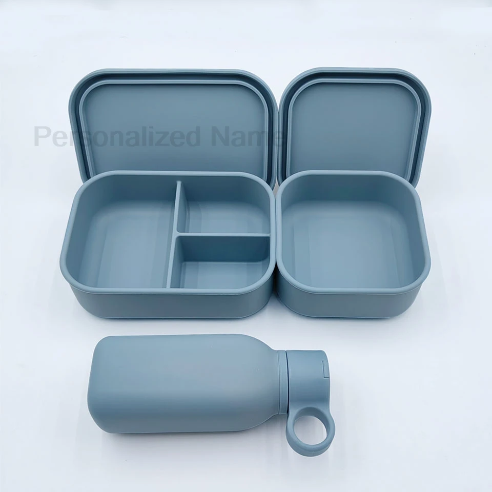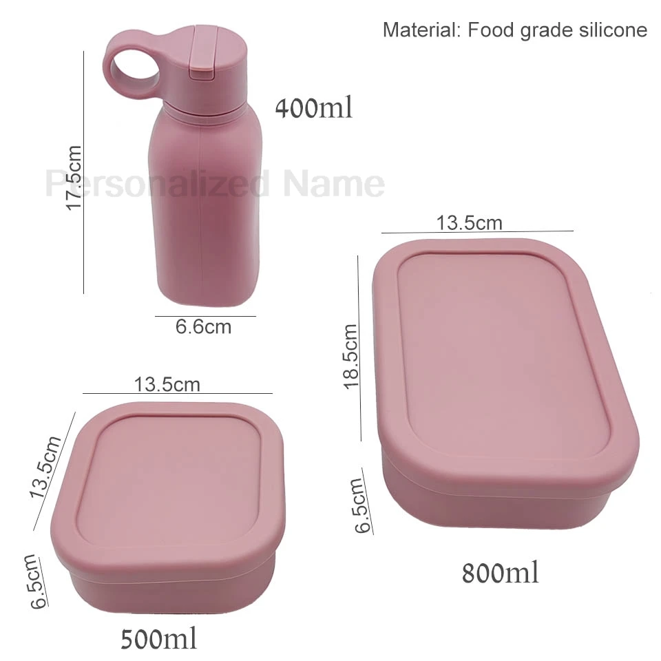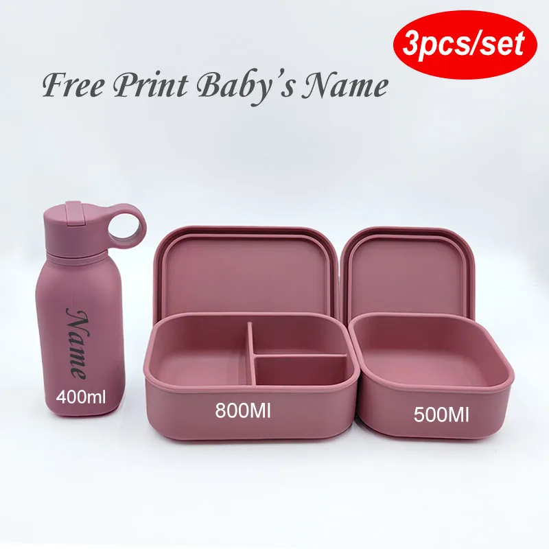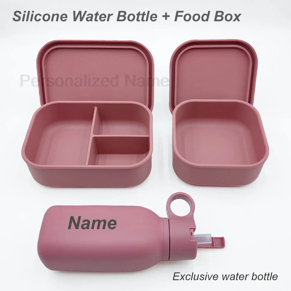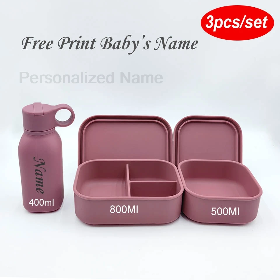 Personalized Name Silicone Water Bottle Lunch Box 3 Compartment Leakproof Bento Lunch Box For Kids Portable Camping Picnic Food Box BPA free can be put into microwave dishwasher