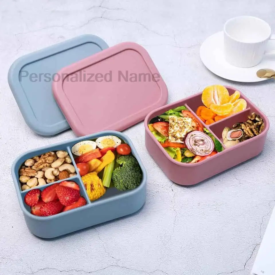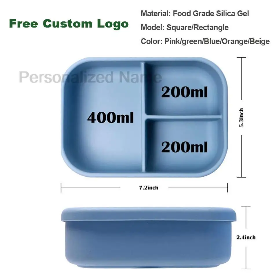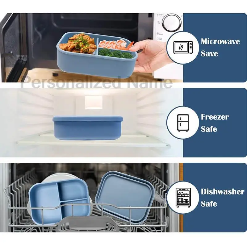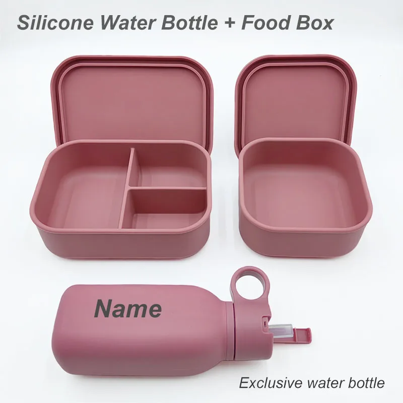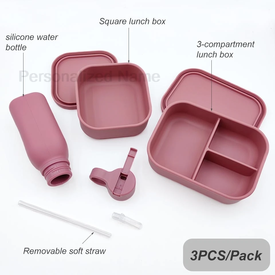 Personalized Name Silicone Water Bottle Lunch Box 3 Compartment Leakproof Bento Lunch Box For Kids Portable Camping Picnic Food Box BPA free can be put into microwave dishwasher