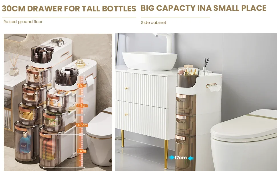 - 【Multi-layered partitions】It has three transparent drawers, with the bottom one being taller and can hold laundry detergent bottles up to 31cm high. The drawers’ transparency makes it easy to identify and access stored items.