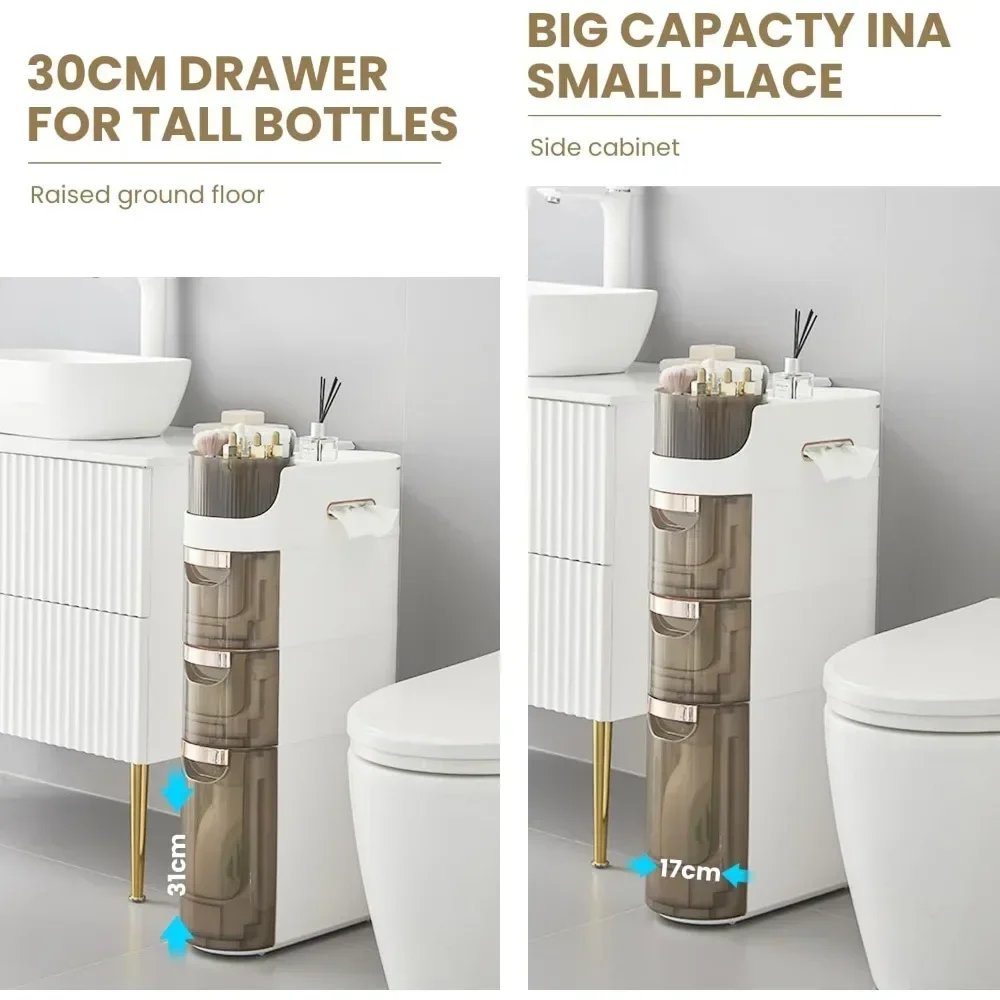 - 【Small Size&Large Capacity】This storage cabinet is designed to fit into small spaces. It is tall and slim but has plenty of room to store your belongings. You can slide it into tight gaps, like between the fridge and wall or the washing machine and toilet. It’s a convenient way to keep your bathroom clutter-free.