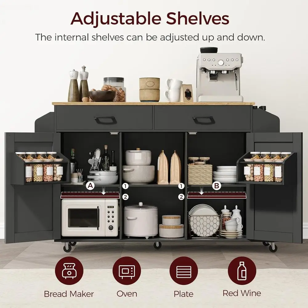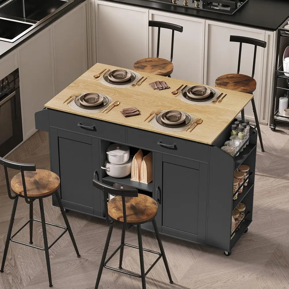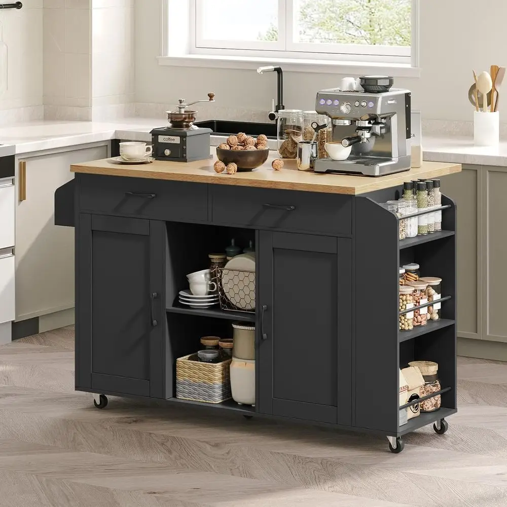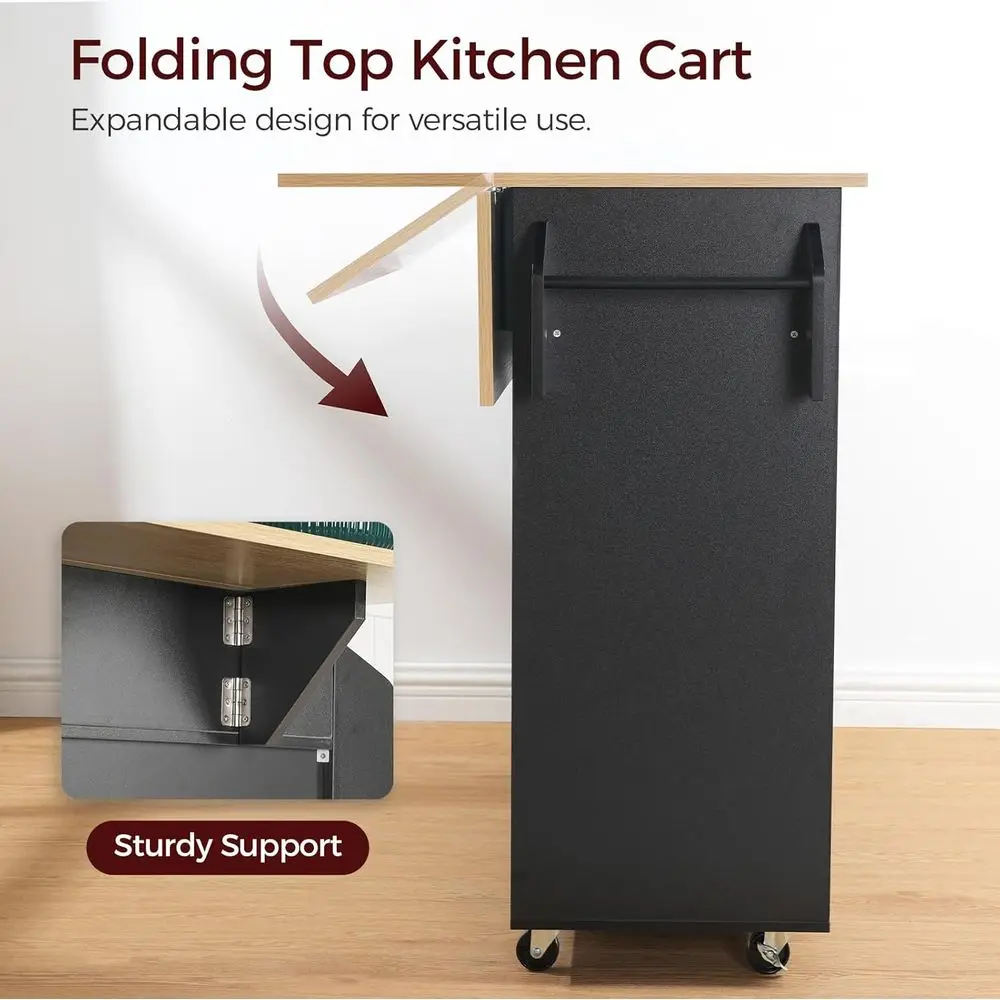 Portable Rolling Kitchen Island with Drop Leaf, Storage, Spice Rack, and Towel Holder – 52.8 Black & Natural KINB12801