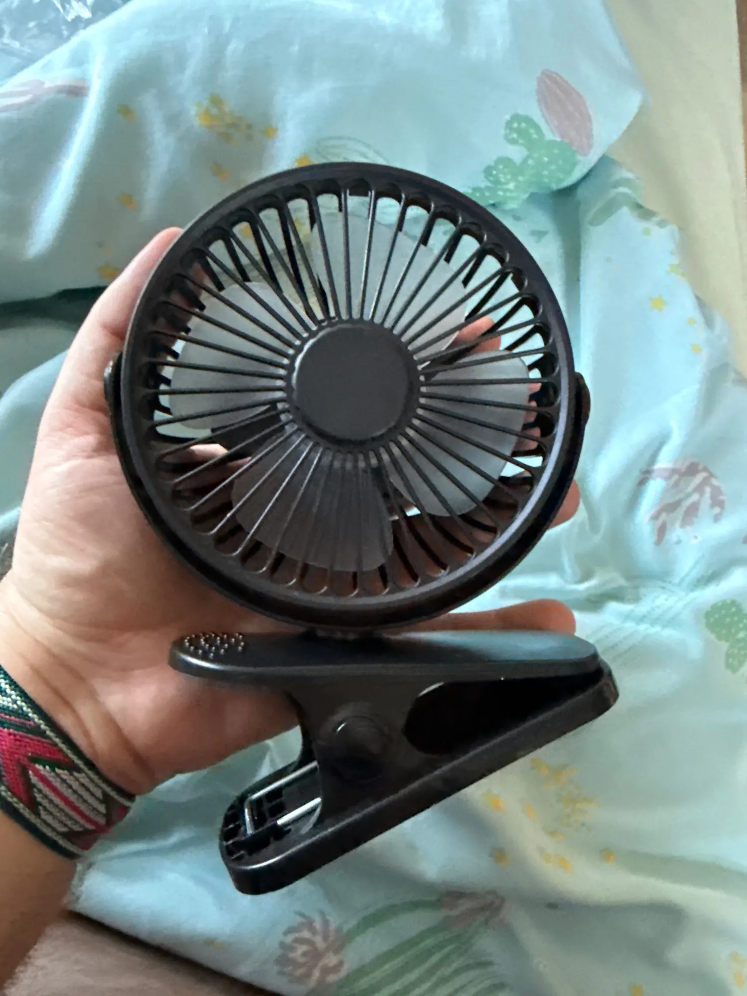 Good and powerful fan, not that noisy. Has a good peg to fasten it somewhere or it can stand on its own. Not sure how long the battery (included!) Lasts but it can work straight from the grid as well (usb cable included) even if the battery was extracted.