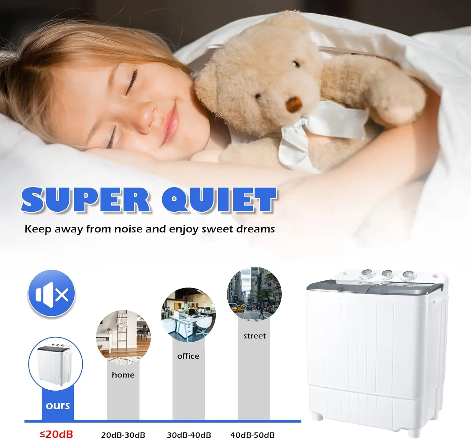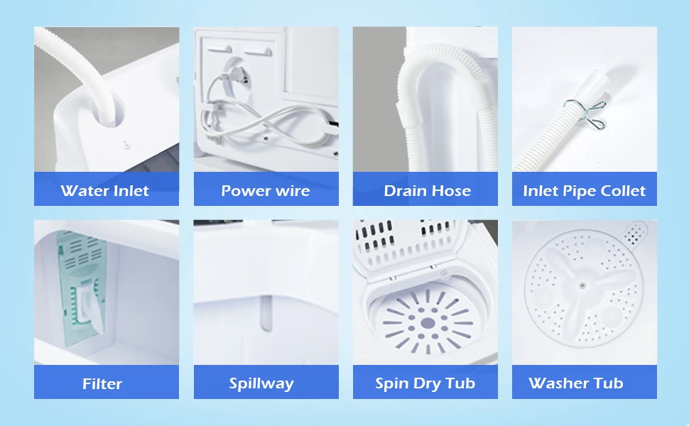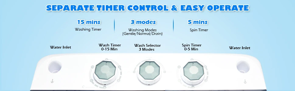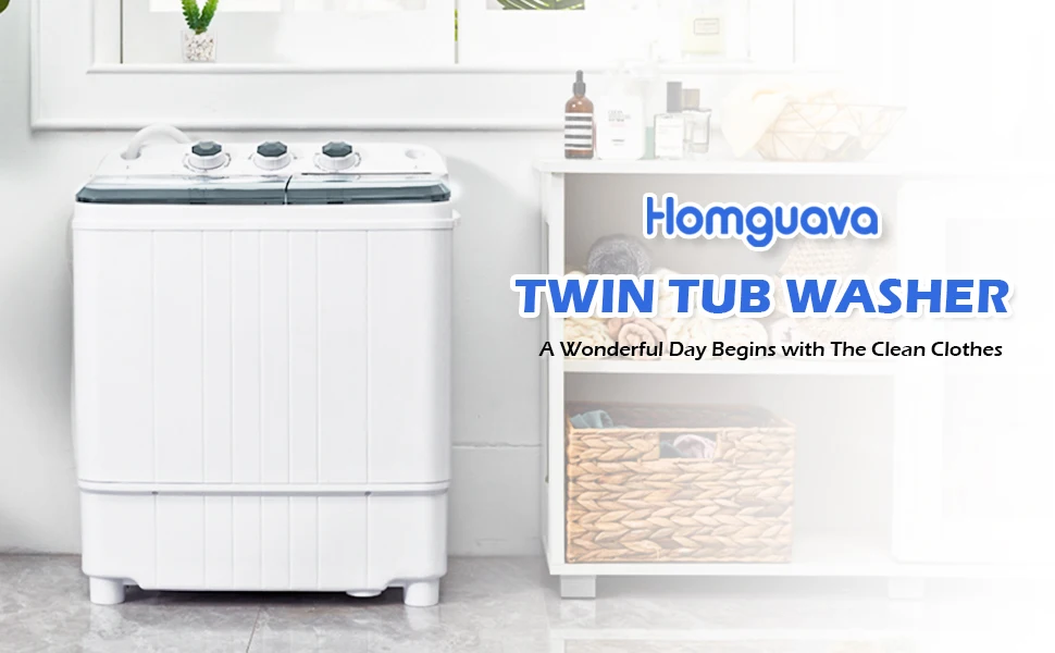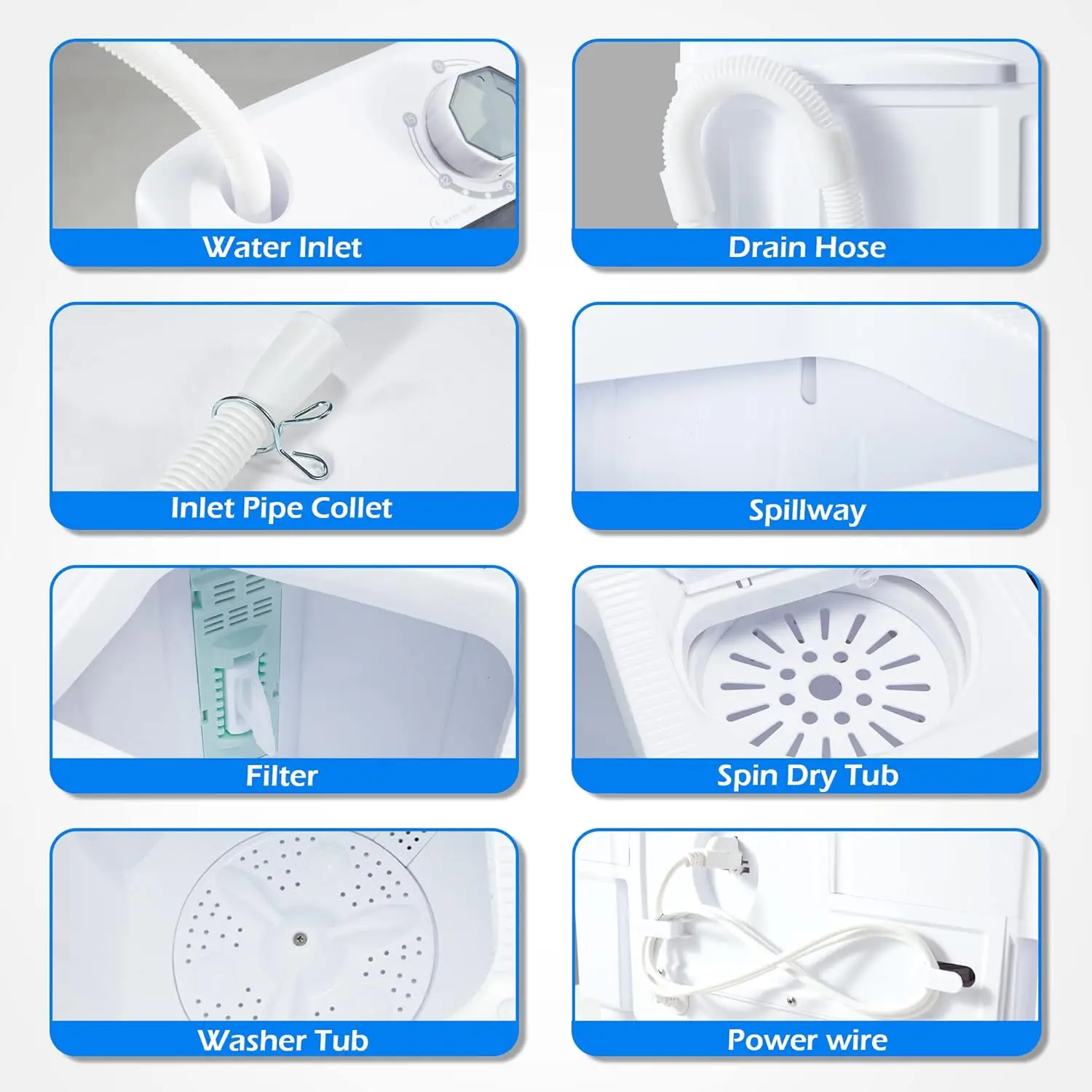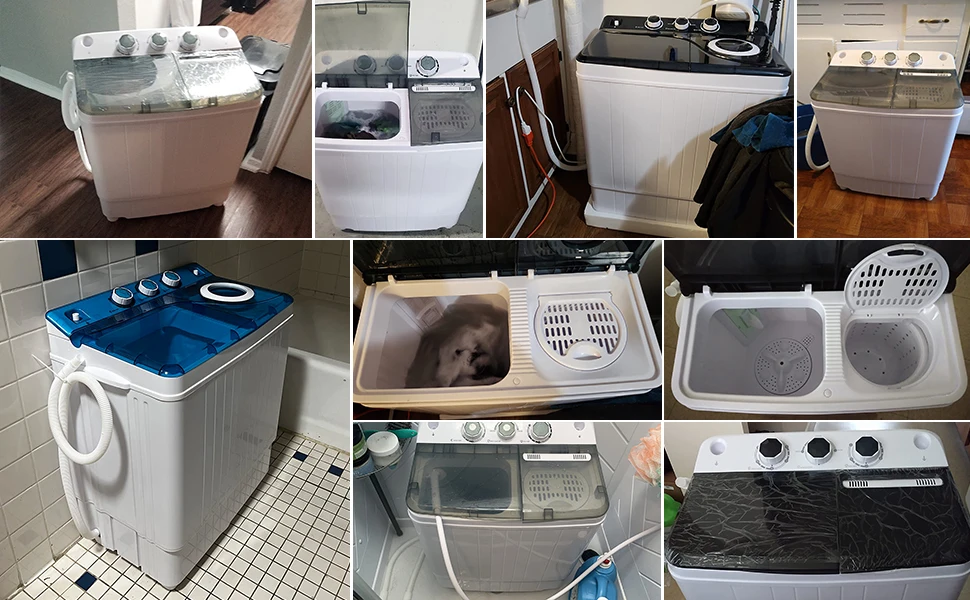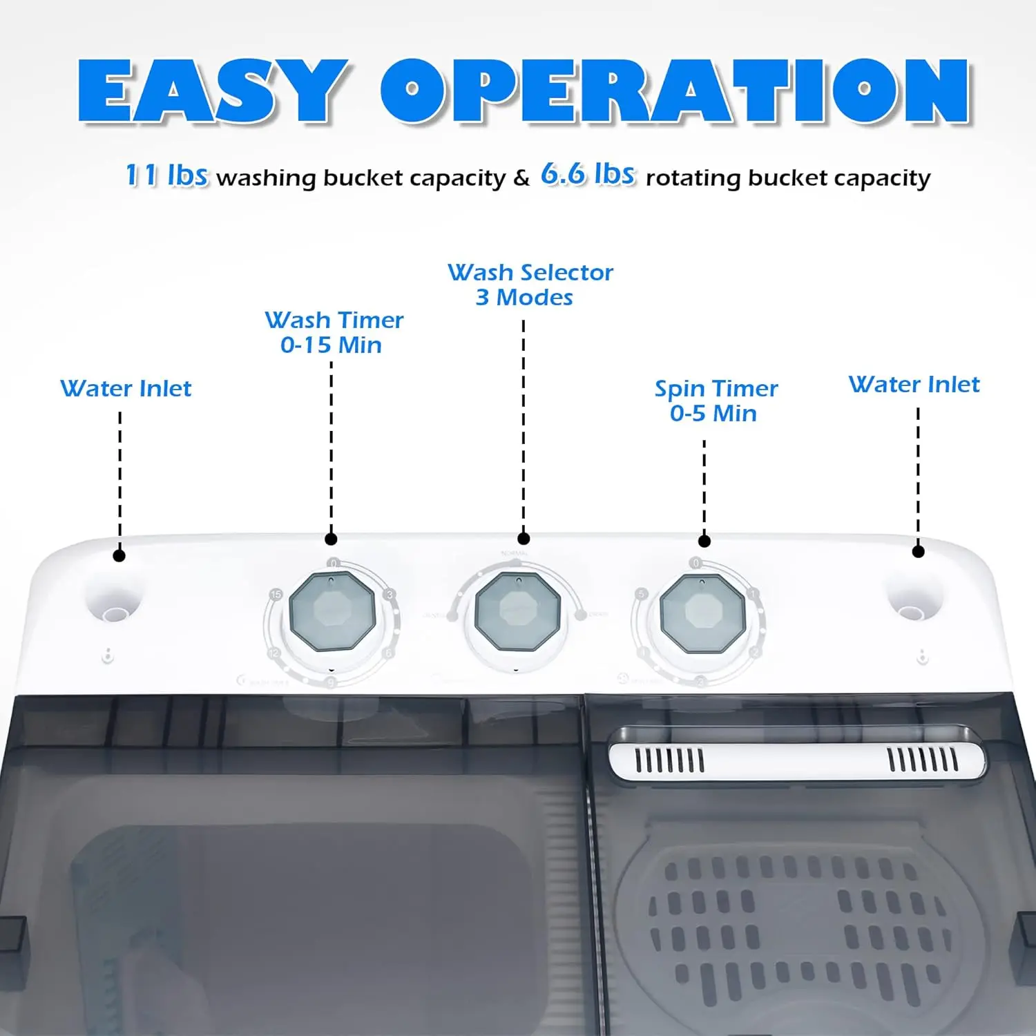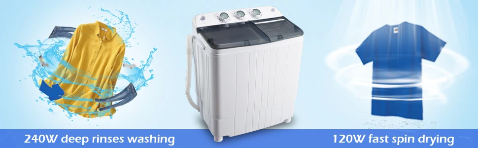 Our Twin-tub clothes washing machine is a good choice to doing laundry. Its compact size allows you to put it in an apartment or dorm or take it to RV. The washing tub is designed with 11lbs capacity while the other spin tub is with 6.6lbs capacity. The mini washer and dryer combo runs with 110v power and in 1300RPM. Our portable washer and dryer features effort-saving operation and water-saving design. You can separately set time for washing and spinning.