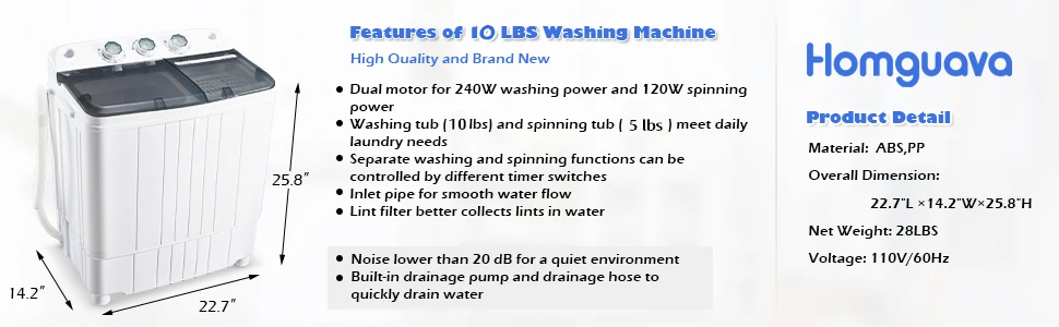 Homguava focuses on the portable washing machine for more than 20 years. According to the purchase demand of you customers, Homguava features on three sizes: Small: 15lbs; Medium: 20lbs; Large: 26lbs. You can choose the most suitable capacity basing on your needs, occasion of use and storage space.