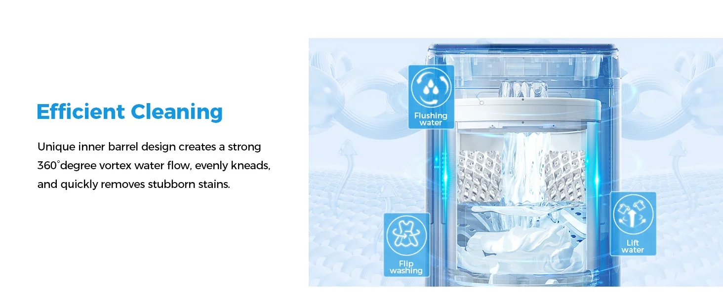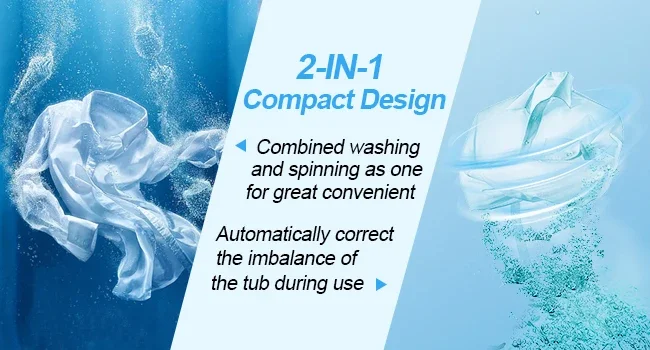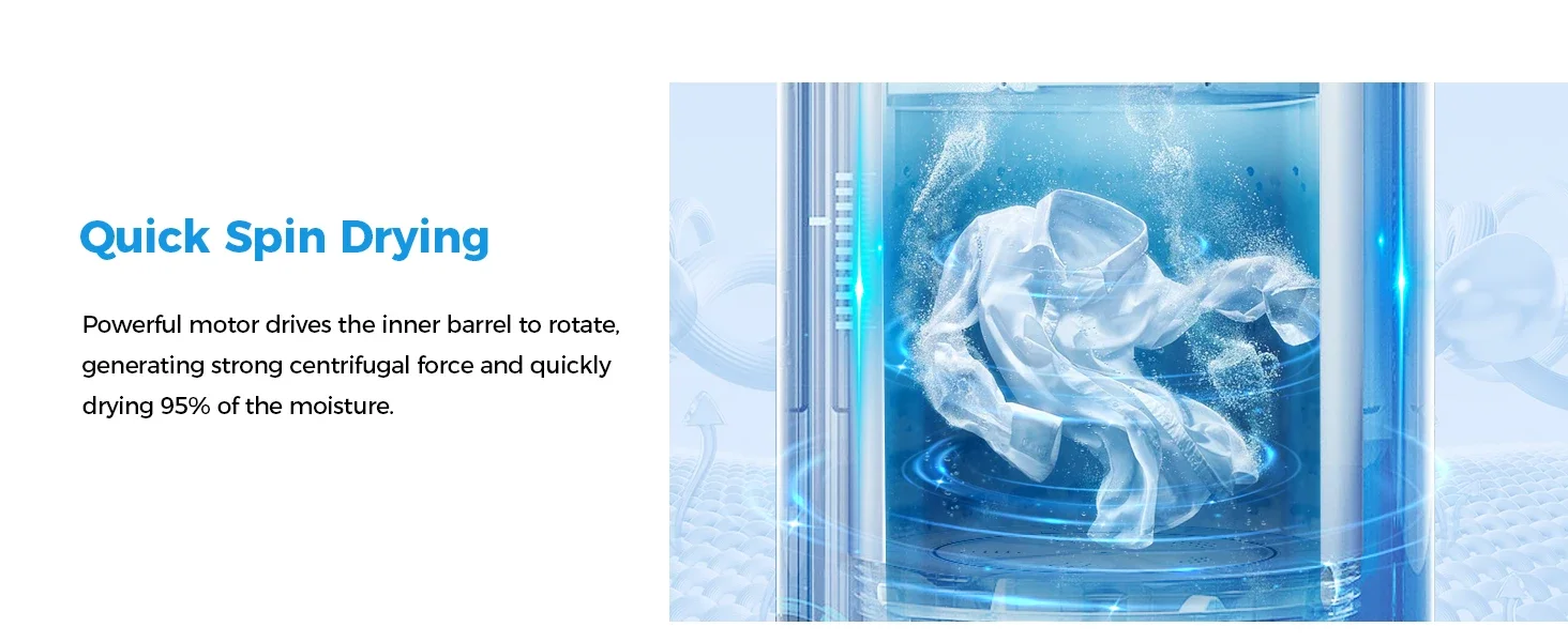 Features a compact and integrated design saves more space. Full-automatic system for efficient cleaning and drying of clothes with just one click. The efficient spin dryer can dry your clothes quickly, taking 97% of the water out!