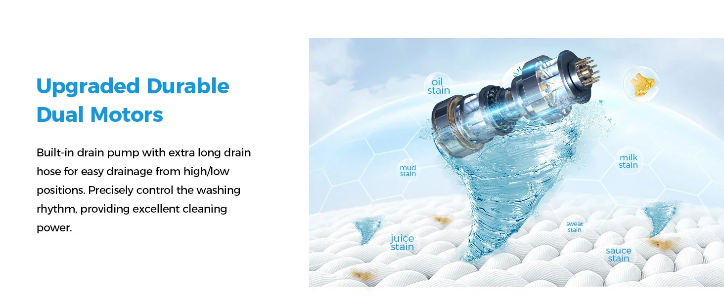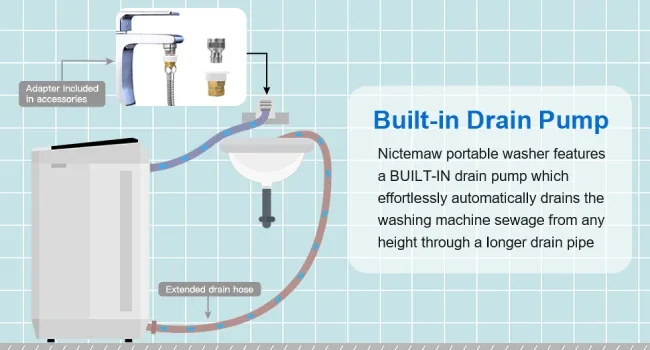 This portable washing machine with drain pump meets North American electrical standards and contains cost-effective accessories-the faucet adapter is included, which saves you a lot of money and solves the problem of faucet installation.