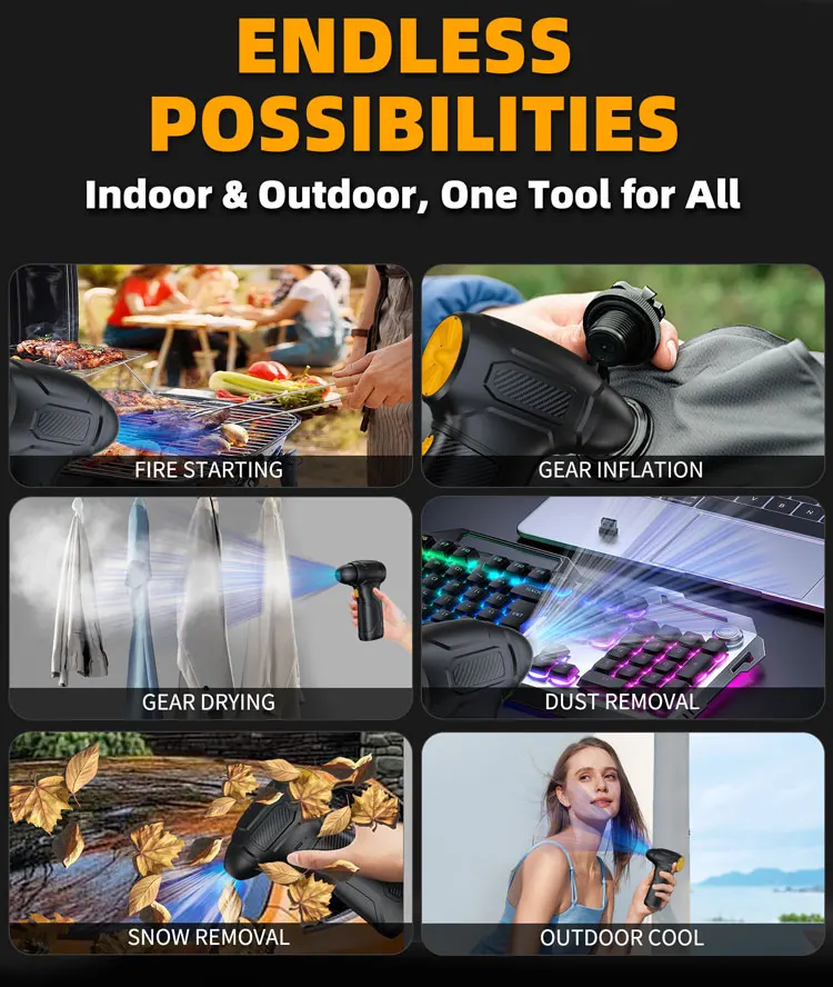 Versatile Applications: Perfect for dust removal, gear drying, snow clearing, fire starting, and even outdoor cooling.
