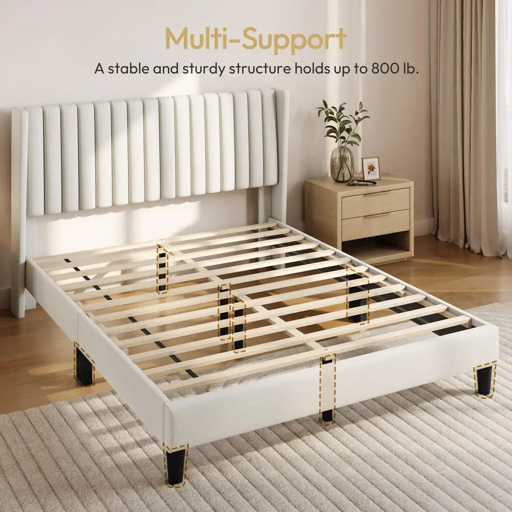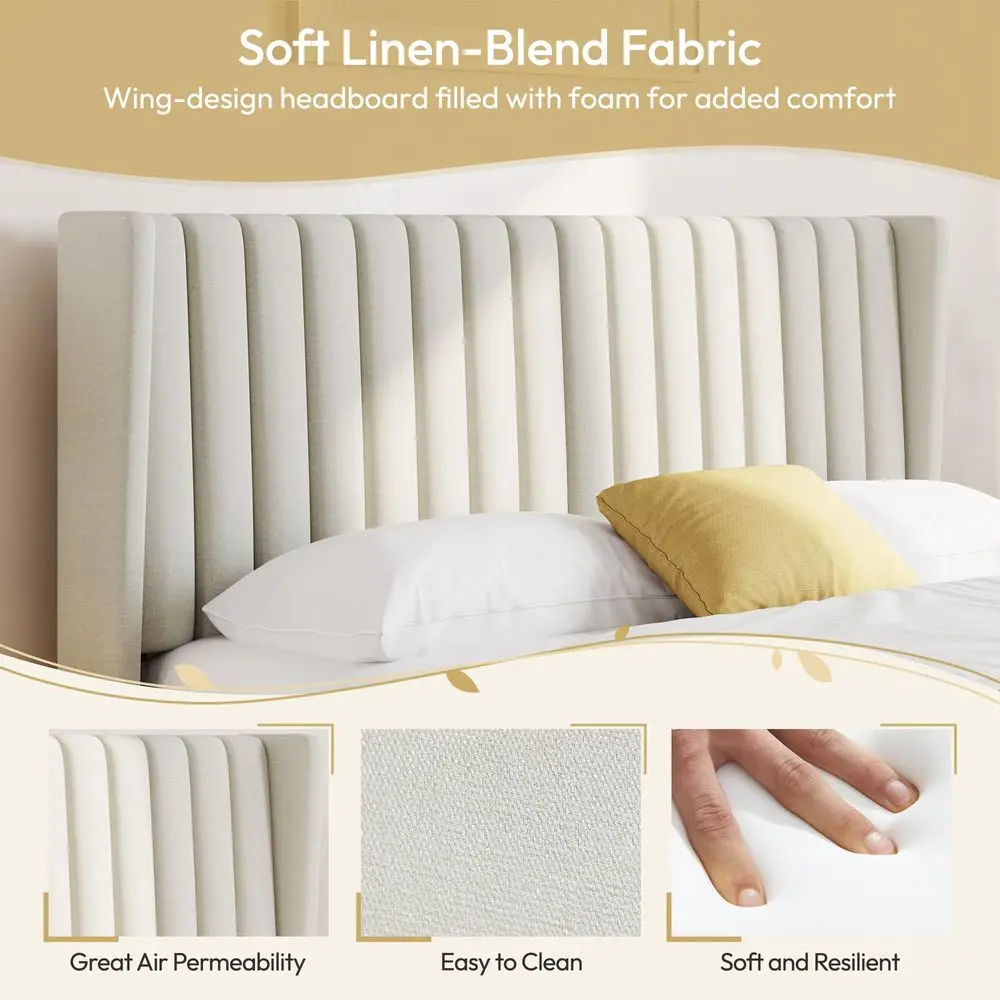 Queen Bed Frame Upholstered Platform Bed with Fabric Headboard, Wing Edge Design NonSlip and NoiseFree Wooden Slats Support No