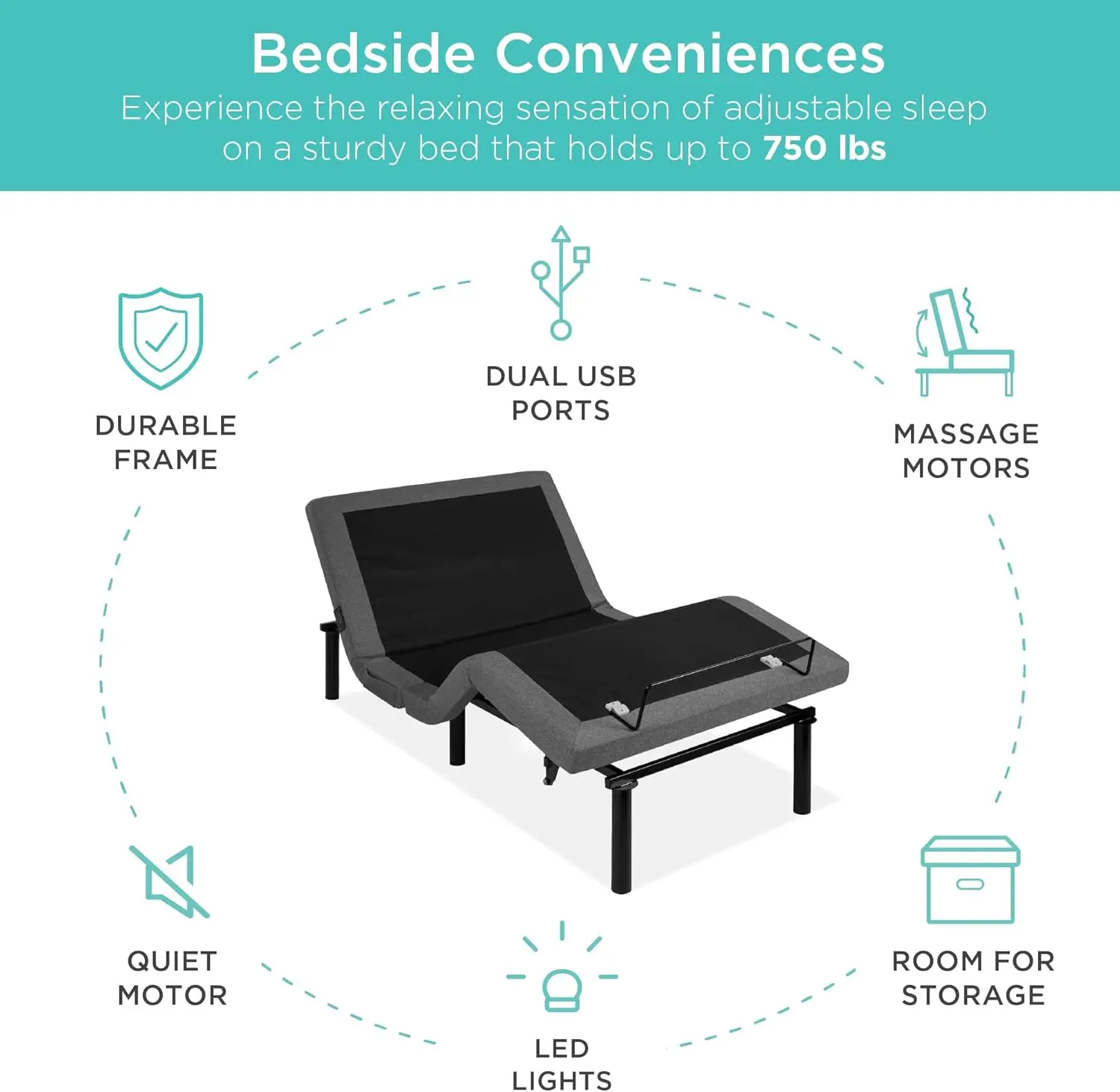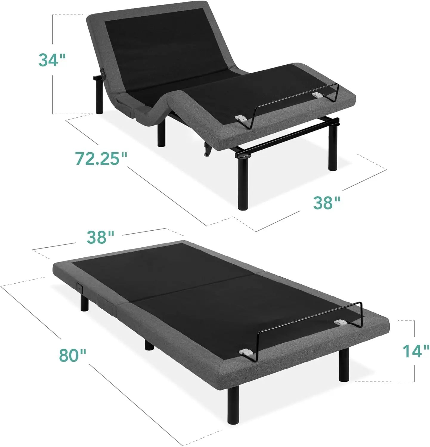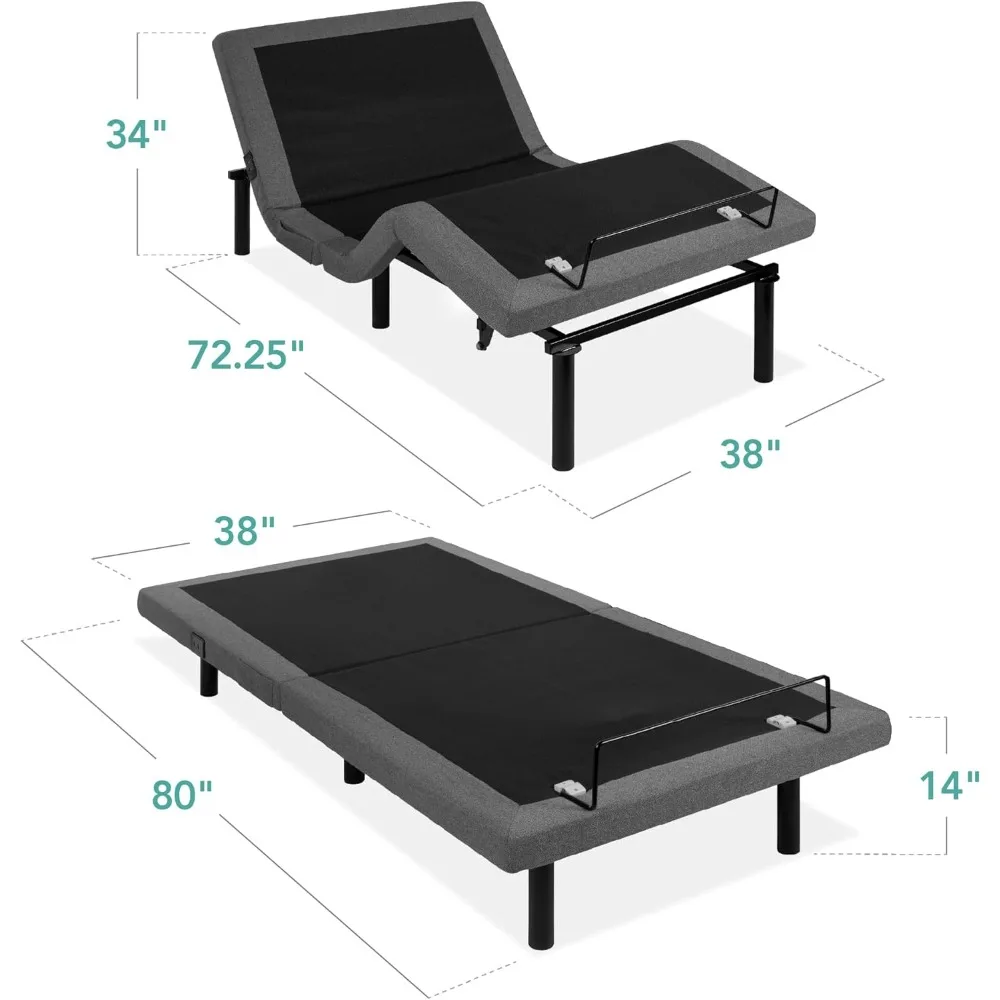 Discover ultimate comfort and convenience with our premium Queen Size Electric Adjustable Bed Frame. This innovative bed base is designed to enhance your sleep experience with multiple adjustable positions. Choose from preset options like TV, Head-Tilt, and Zero Gravity modes or create your own custom settings for personalized relaxation. The separate head and foot incline allows you to manage stress effectively by finding the perfect position for reading, watching TV, or simply unwinding after a long day. Equipped with a user-friendly wireless remote control, you can easily adjust massage settings and bed positions with just a click of a button. Enjoy soothing massage modes including wave, pulse, and constant patterns to help relieve muscle tension and promote better rest. The remote also features a handy flashlight function for added convenience in low-light conditions. This bed frame includes practical bedside amenities to keep your essentials within reach. Charge your devices effortlessly using the built-in USB ports located conveniently on the side. A spacious side pocket provides storage for your phone, remote control, or other small items. Gentle night lights installed underneath the frame illuminate your floor area softly, making it easy to find your slippers during nighttime visits without disturbing your sleep. Compatible with various mattress types including memory foam, gel foam, latex foam, and hybrid mattresses up to 750 lbs capacity. With overall dimensions of 80 inches in length, 59 inches in width, and 14.25 inches in height (203 cm L x 150 cm W x 36 cm H), this sturdy frame fits standard queen size bedding perfectly while providing robust support. Transform your bedroom into a sanctuary of relaxation where every night promises rejuvenating sleep tailored exactly how you prefer it – all at an affordable price point that delivers exceptional value without compromising on quality features typically found only in higher-end models.