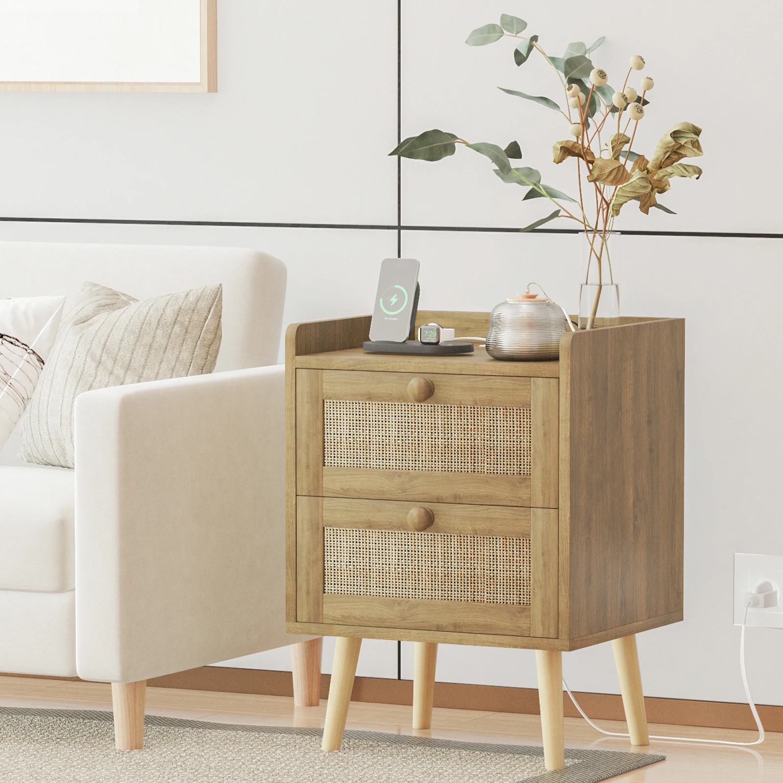 Rattan Nightstand with Charging Station, Rustic Bedside Table with 2 Drawers, Natural Nightstand for Bedroom