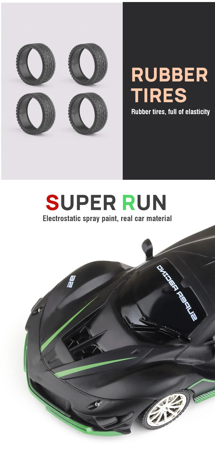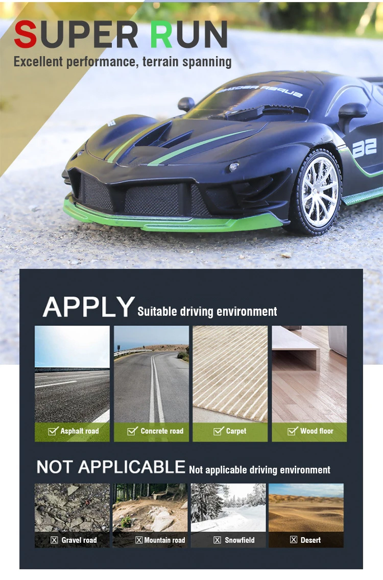 scratches. This remote control car works best on a flat surface, has the perfect curvature of a super body, and can be used indoors or outdoors.
