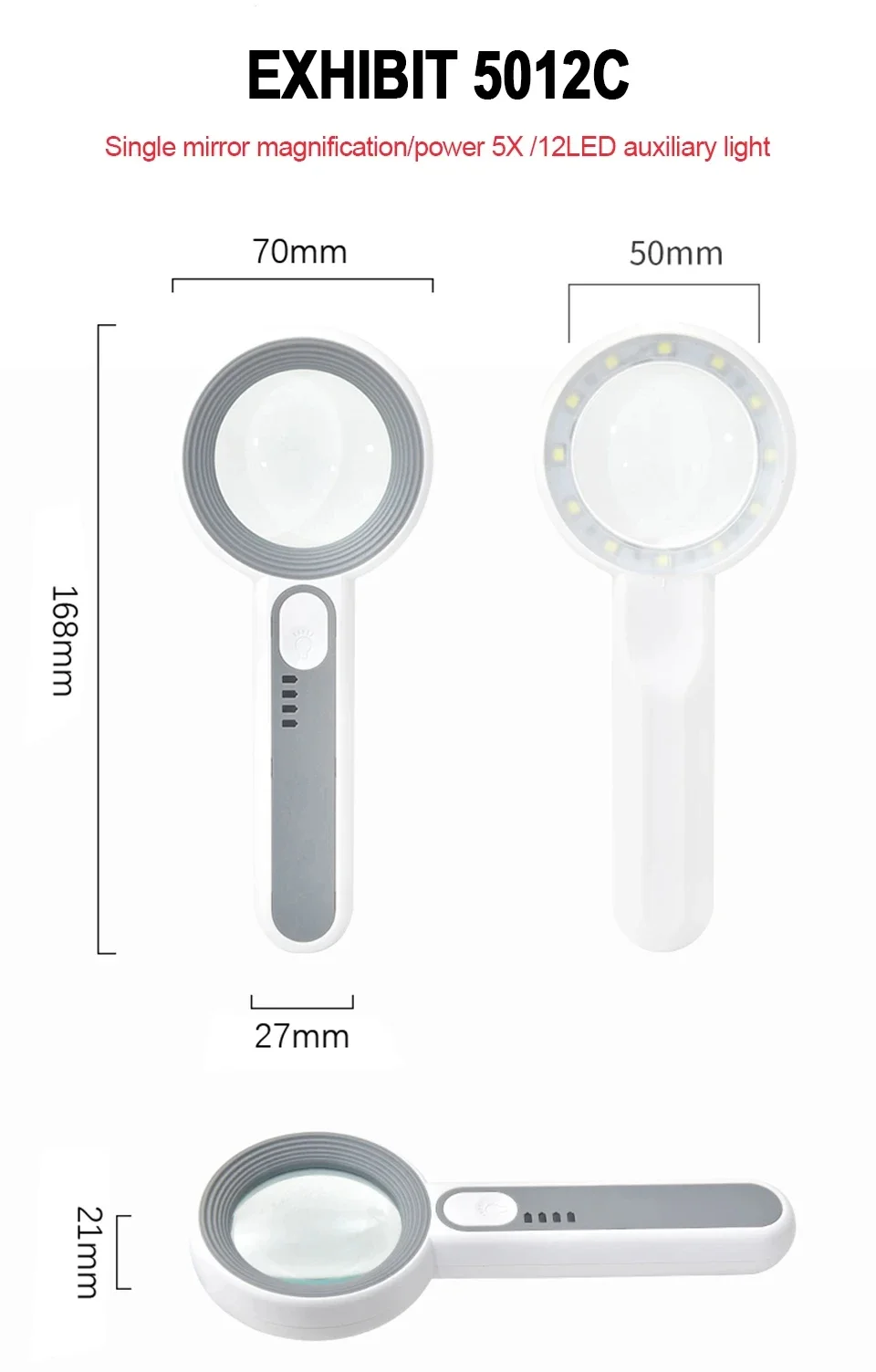 Rechargeable 12X Portable Magnifying Glass with LED Light for Seniors Reading Jewelry Craft Coin Stamp Inspection Repair