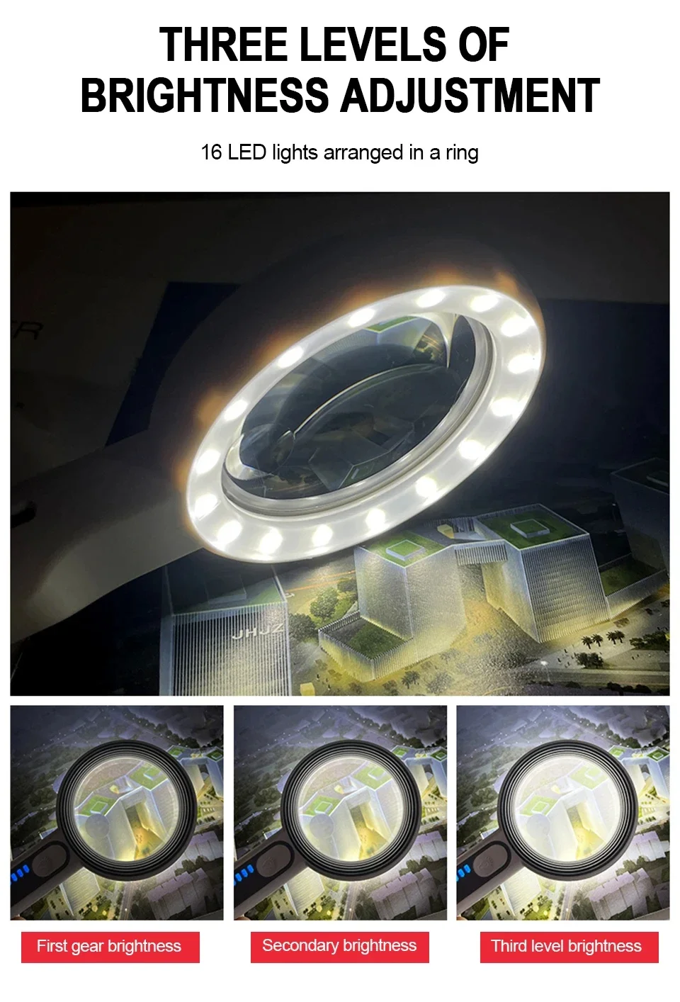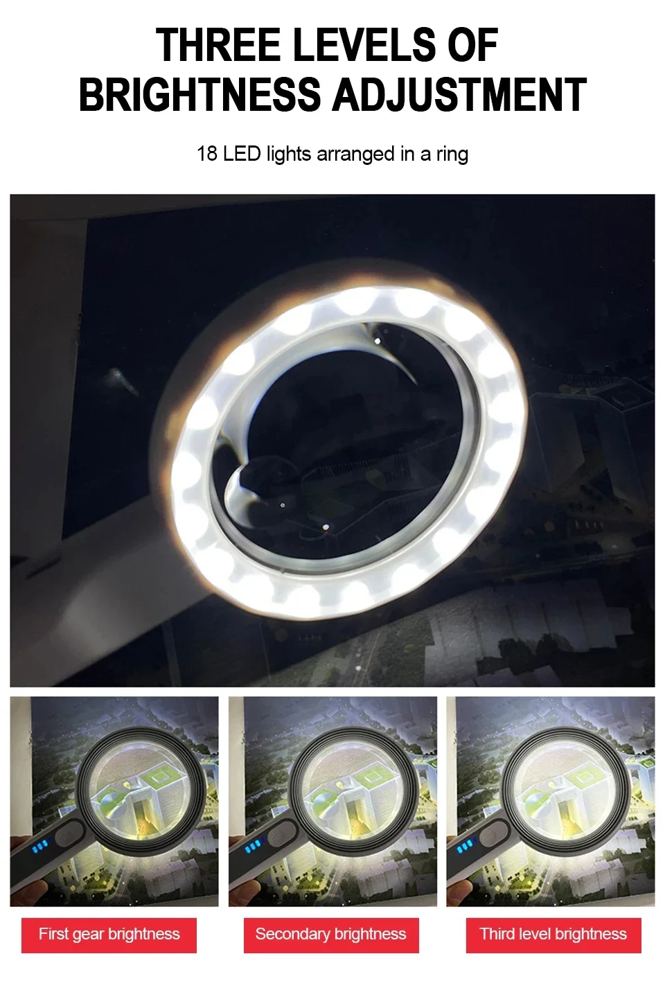 2. 3 Lighting Modes: Magnifying glass are surrounded by, LED lights. Three lighting modes can be created, including white, yellow and warm light.
