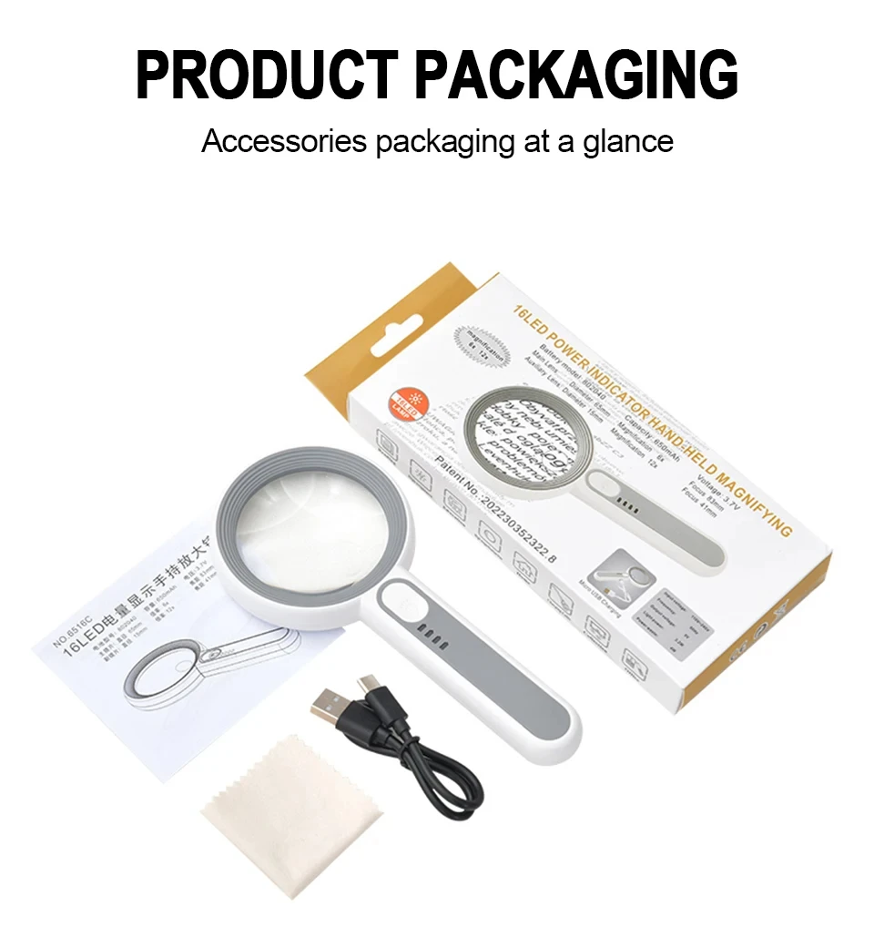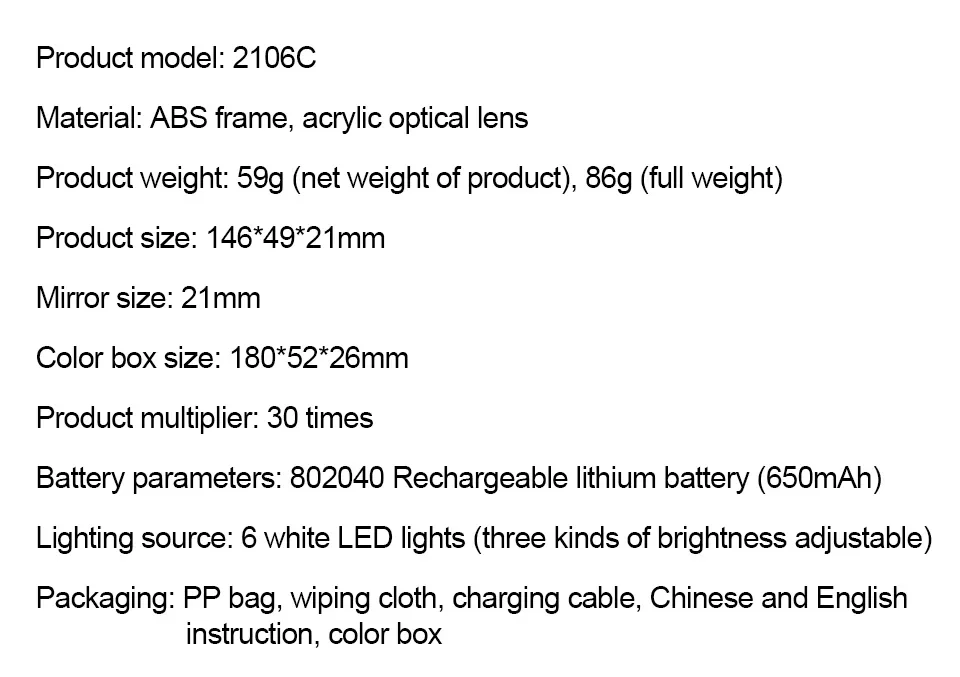 Delivery is fast, the seller is reliable! I liked the magnifier itself. The diodes light up very brightly, with three brightness levels. The package includes a charging cable, and don’t accidentally throw away the cloth for cleaning the magnifier (if you need it). One inconvenience, so far, is that it’s very sensitive, even too sensitive, for me personally – the on/off button. I hope I’ll get used to it.