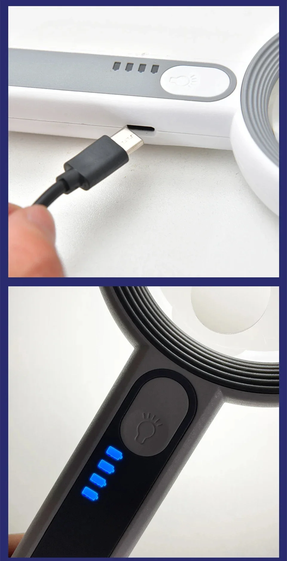 The magnifier is lightweight, the lighting is excellent, and it charges via USB.