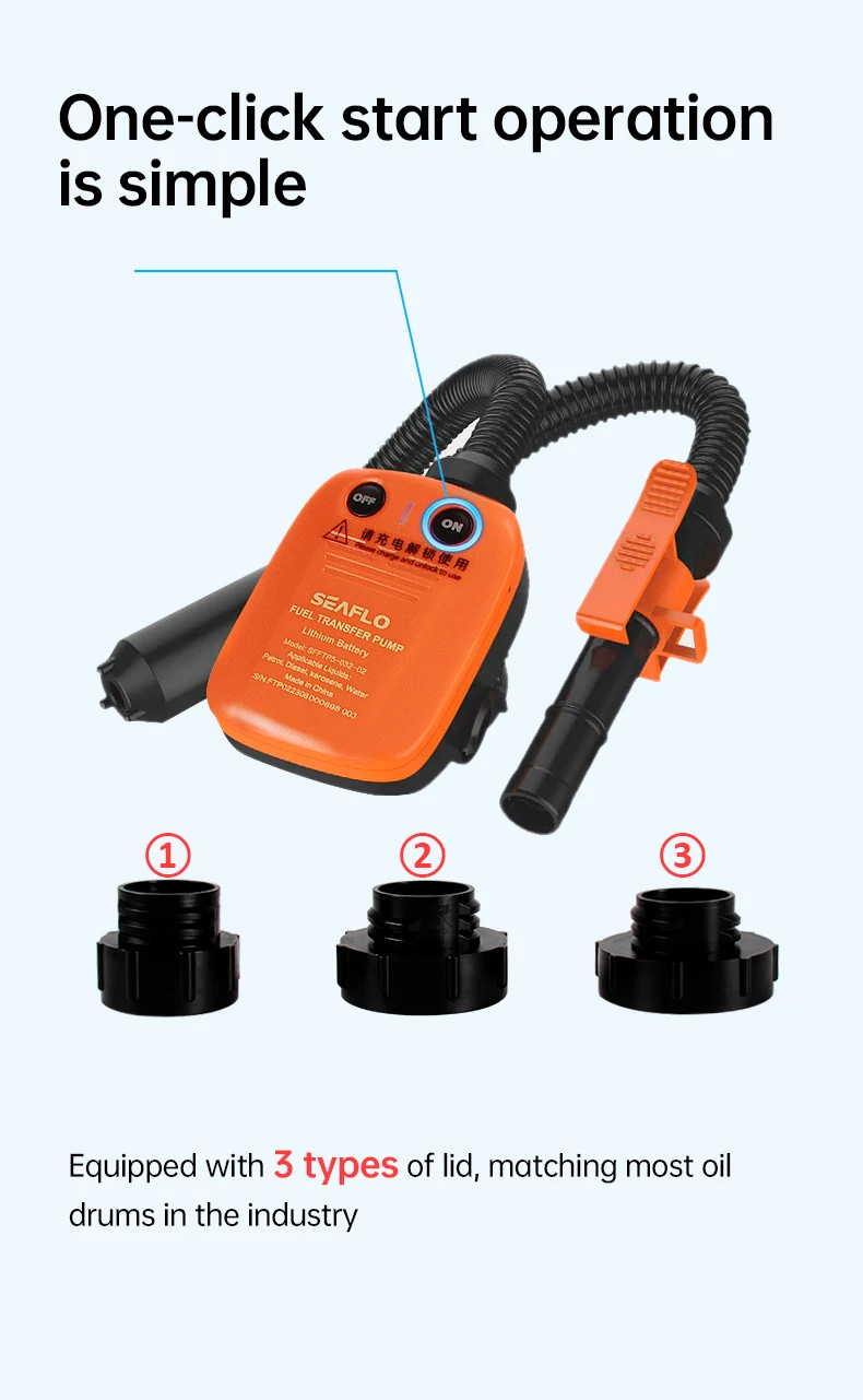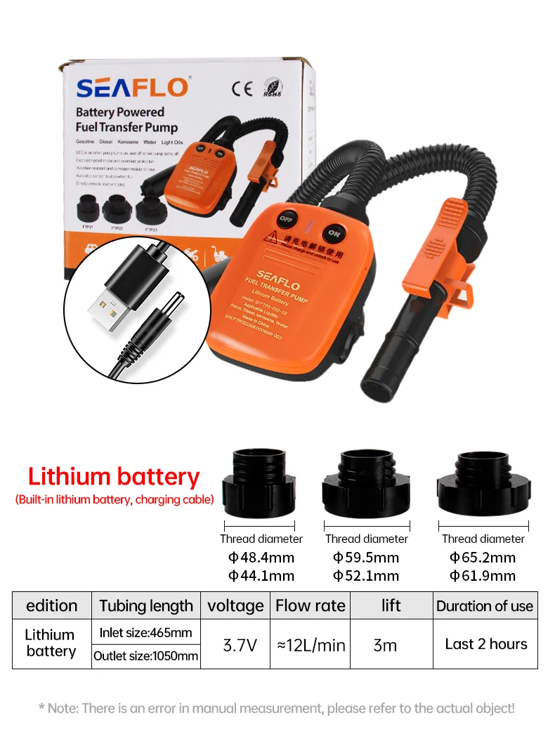 This pump with lithium battery is very good. It empties a 25 litre can in a few minutes leaving just around 1 litre in the bottom. The thread and adapters does not fit any European standard can but it is not important for me as the pump works anyway.
