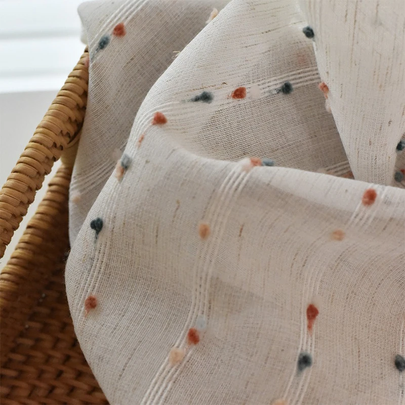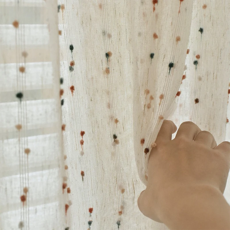 Retro linen-textured sheer curtains with colorful jelly bean pattern, easy to hang, suitable for bedroom and living room