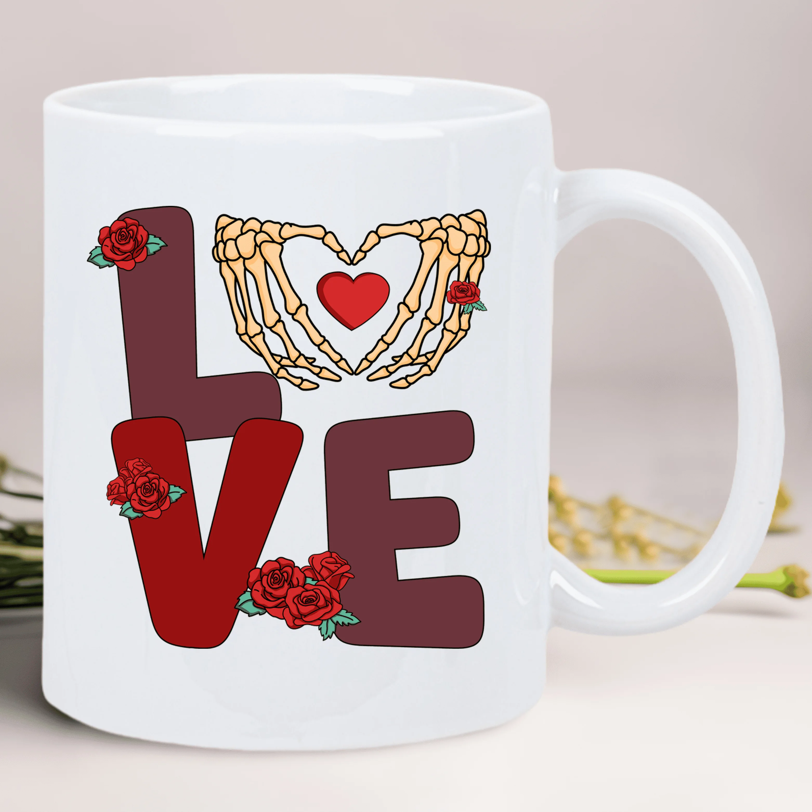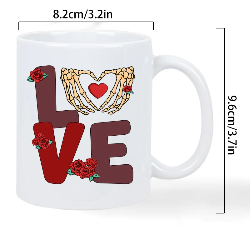Retro Valentine’s Love Ceramic Coffee Mug – Reusable, Hand-Wash Only, White with Skeleton Hands & Roses Design – Perfect Gift fo
