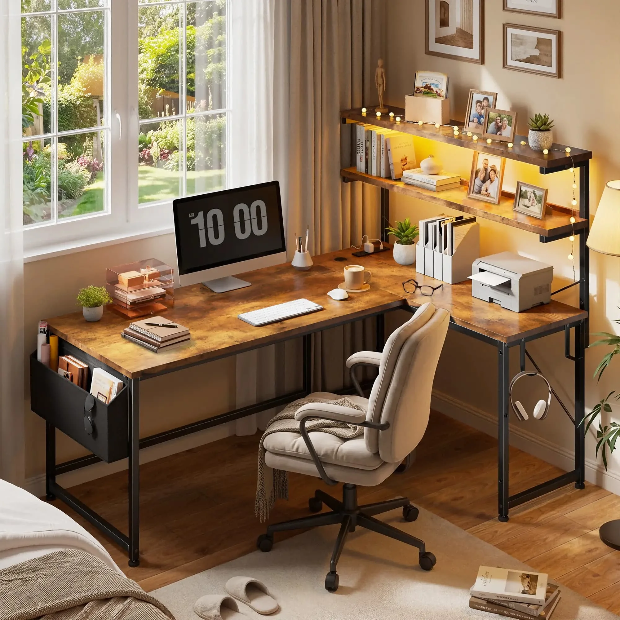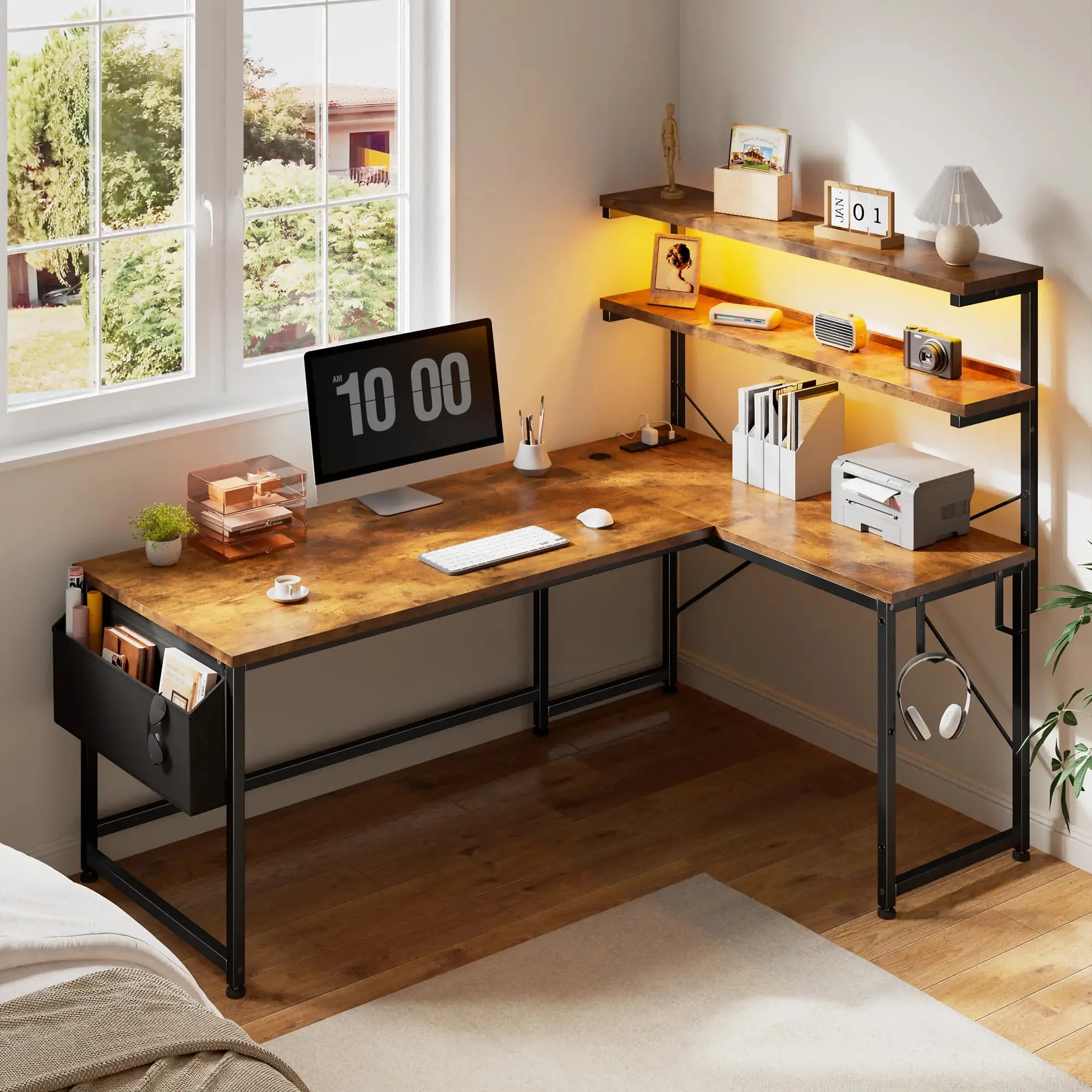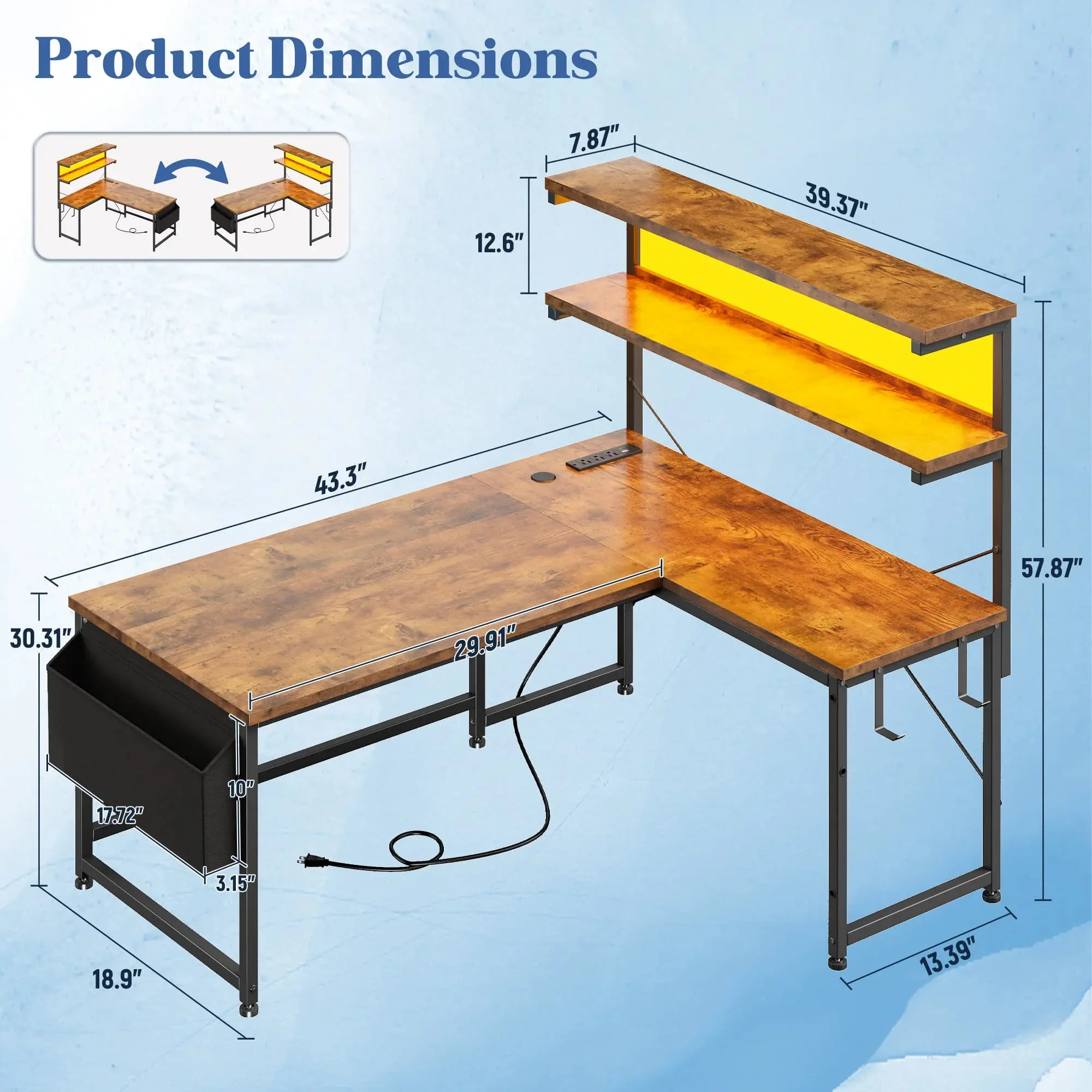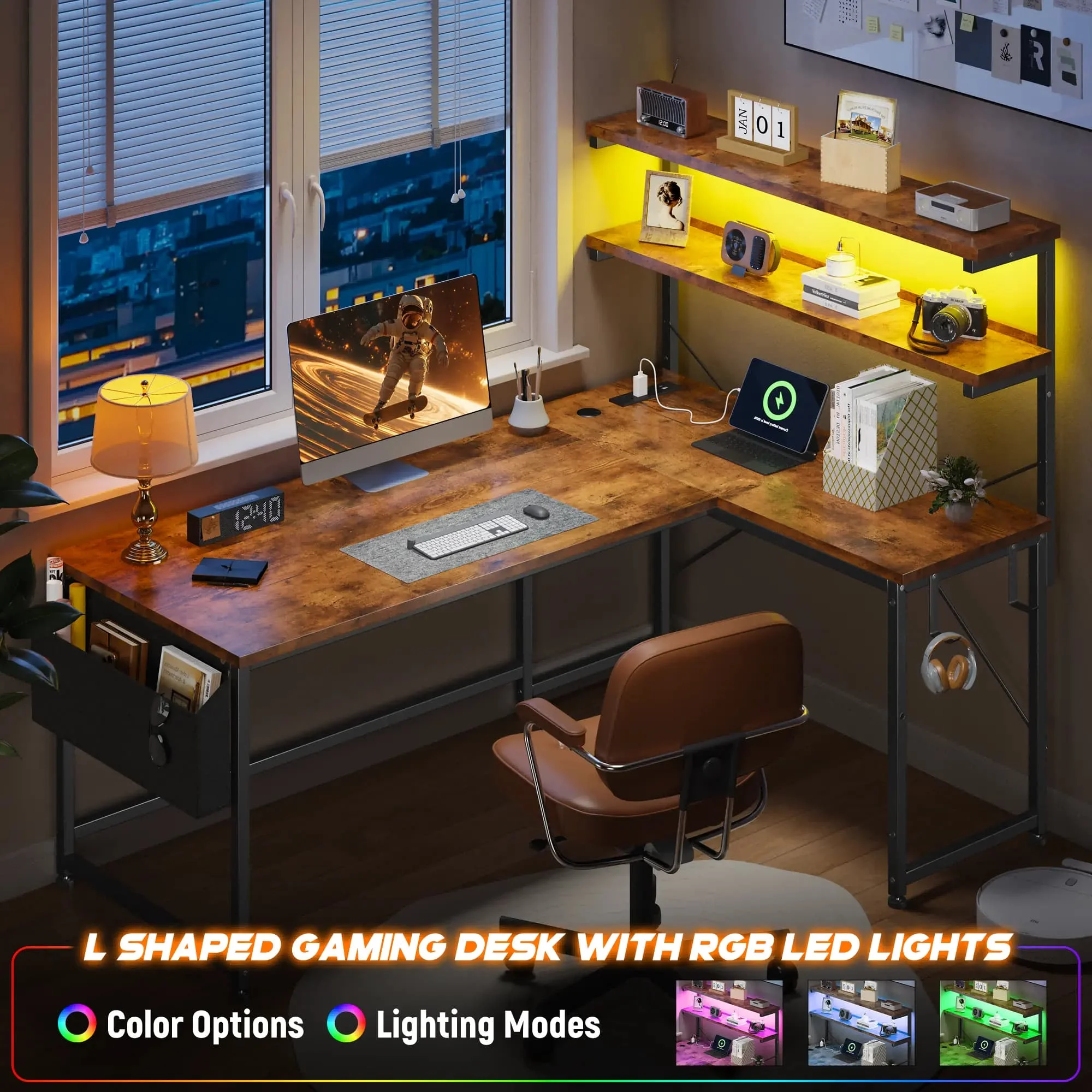 Reversible L Shaped Desk Computer Desk with LED Light & Power Outlet Gaming Desk with Shelf & Storage Bag & Hook for Home Office