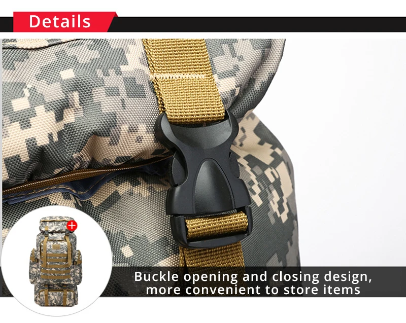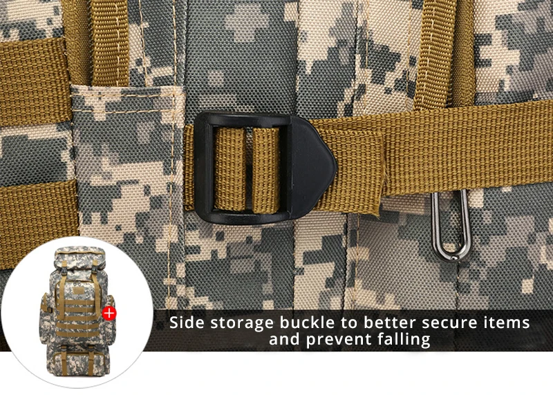 • Tactical Camouflage Design :The backpack features a tactical camouflage design that blends in with natural surroundings, making it ideal for military personnel and hunters.