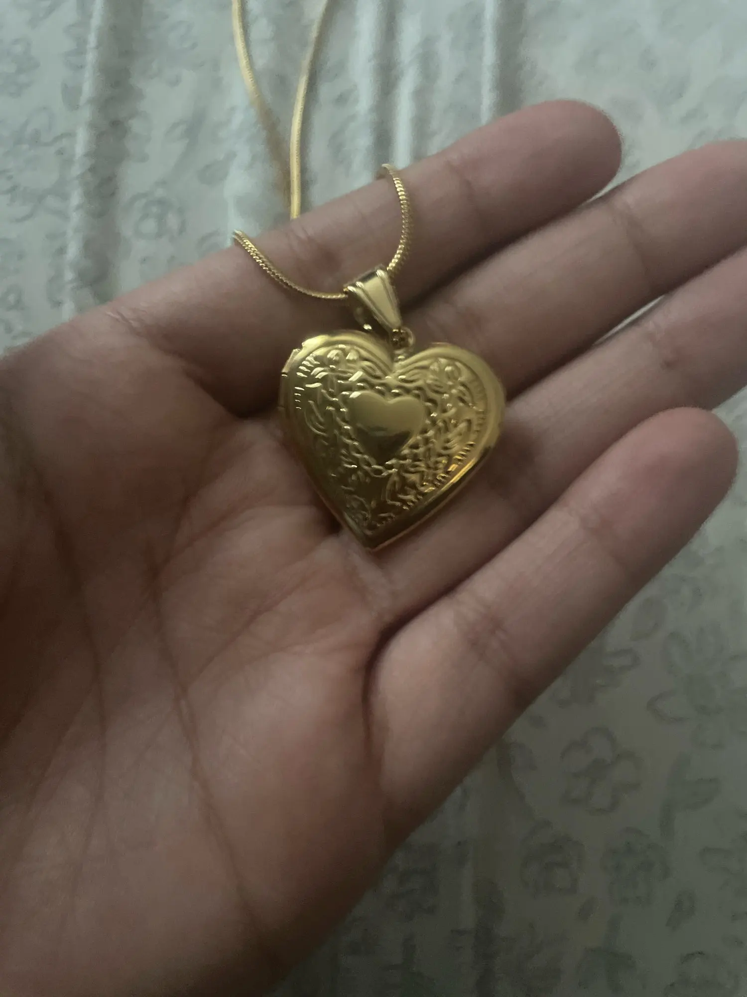 It’s bigger than i thought it would be but that’s my fault because i didn’t know it was a locket but i really like because it’s gold, it shipped fast and a three days before it was supposed to arrive