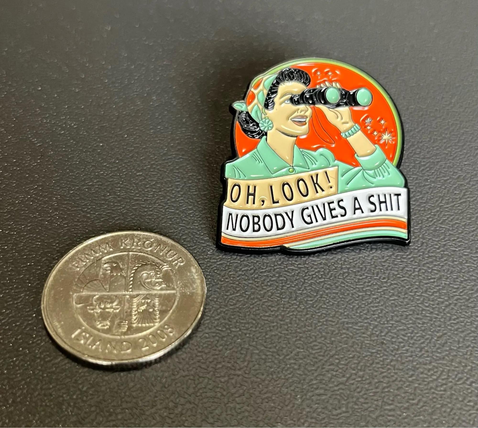 Well crafted enamel pin – vibrant colors with no issues. Shown in the accompanying photograph with an icelandic 5 kr coin for size comparison.