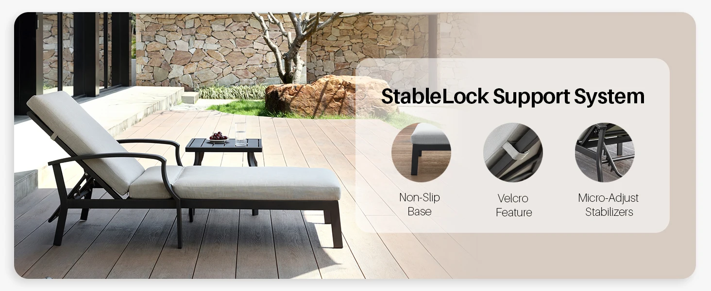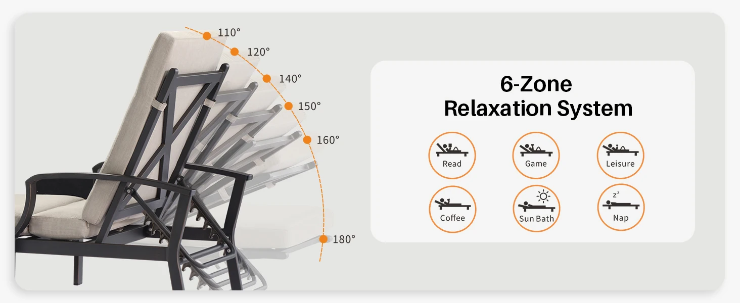 • 6-Position Adjustable Comfort: This SeeHill outdoor chaise lounge chair features a customizable backrest that reclines from upright to fully flat, allowing you to relax, read, nap, or sunbathe at your preferred angle. Perfect for poolside lounging, patio downtime, or beachside escapes, it adapts effortlessly to your relaxation style.