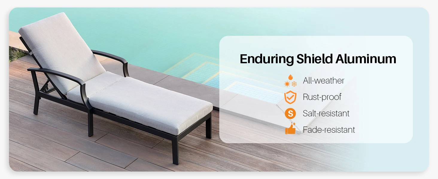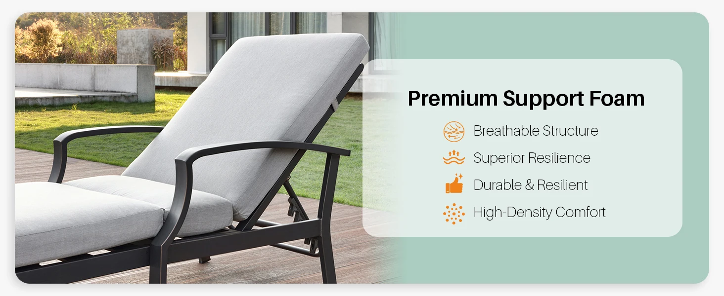 • Lightweight Yet Sturdy Aluminum Frame: Built with rust-proof powder-coated aluminum in a sleek gunmetal finish, this chaise lounge weighs only 23.1 lbs (10.5 kg) but supports up to 300 lbs. Its lightweight design allows for easy portability, while the robust construction ensures years of outdoor durability.