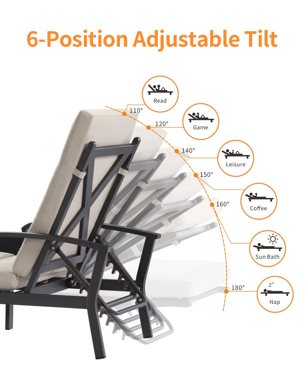 • 6-Position Adjustable Comfort: This SeeHill outdoor chaise lounge chair features a customizable backrest that reclines from upright to fully flat, allowing you to relax, read, nap, or sunbathe at your preferred angle. Perfect for poolside lounging, patio downtime, or beachside escapes, it adapts effortlessly to your relaxation style.