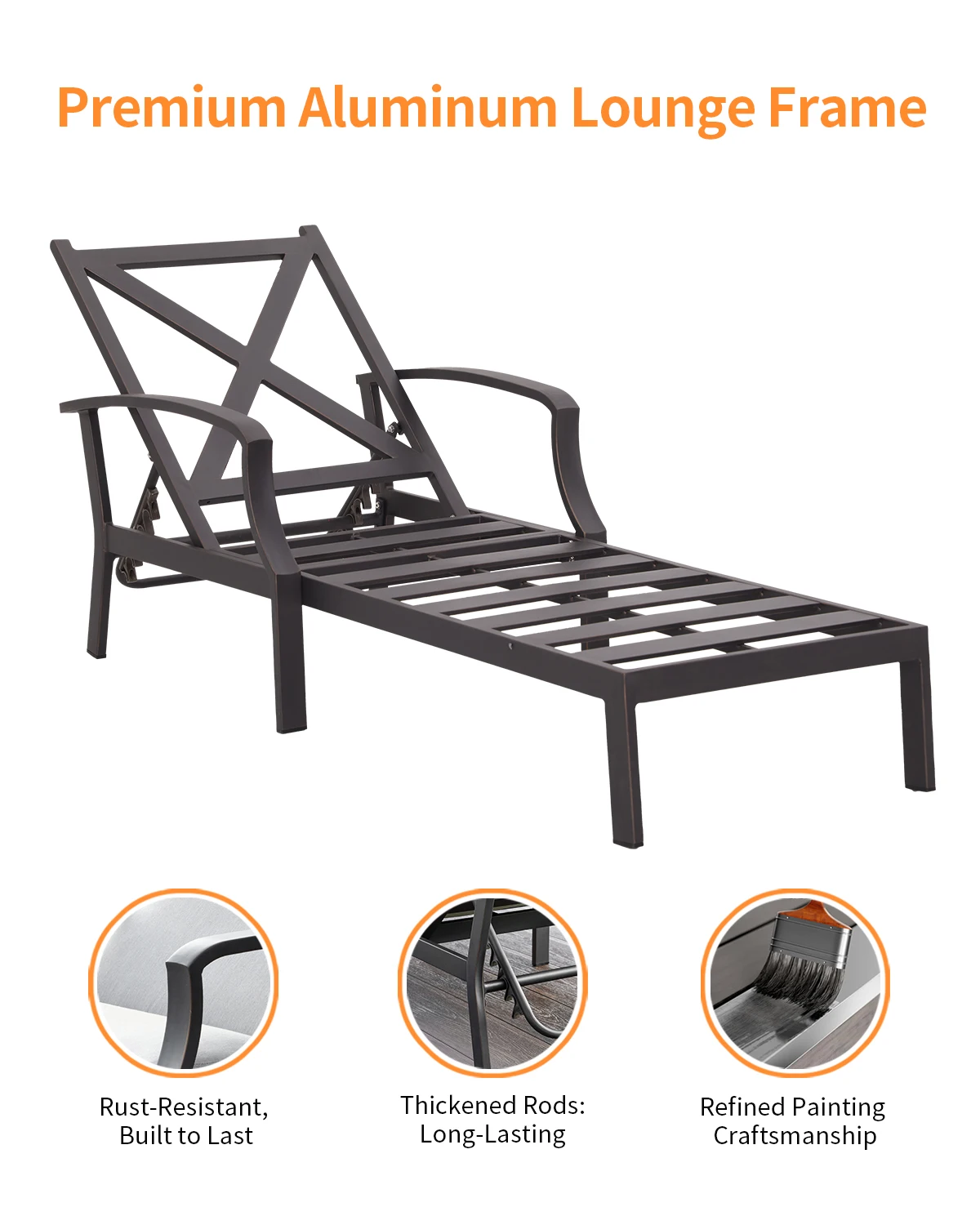 • Lightweight Yet Sturdy Aluminum Frame: Built with rust-proof powder-coated aluminum in a sleek gunmetal finish, this chaise lounge weighs only 23.1 lbs (10.5 kg) but supports up to 300 lbs. Its lightweight design allows for easy portability, while the robust construction ensures years of outdoor durability.