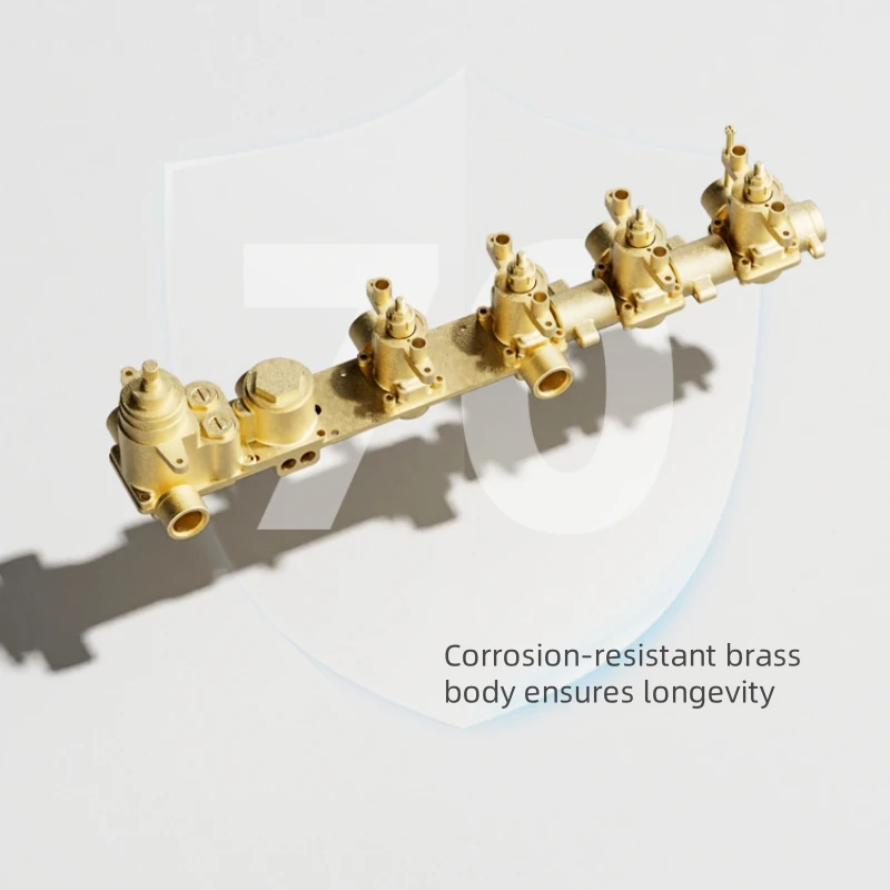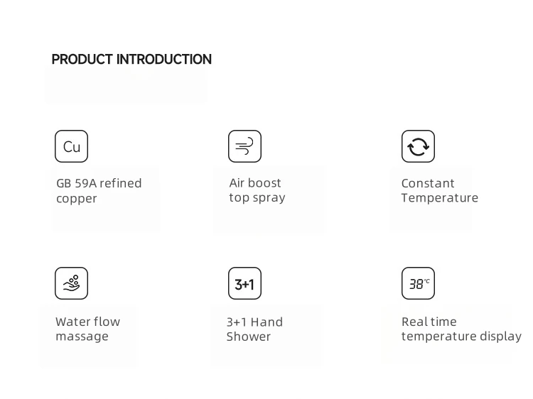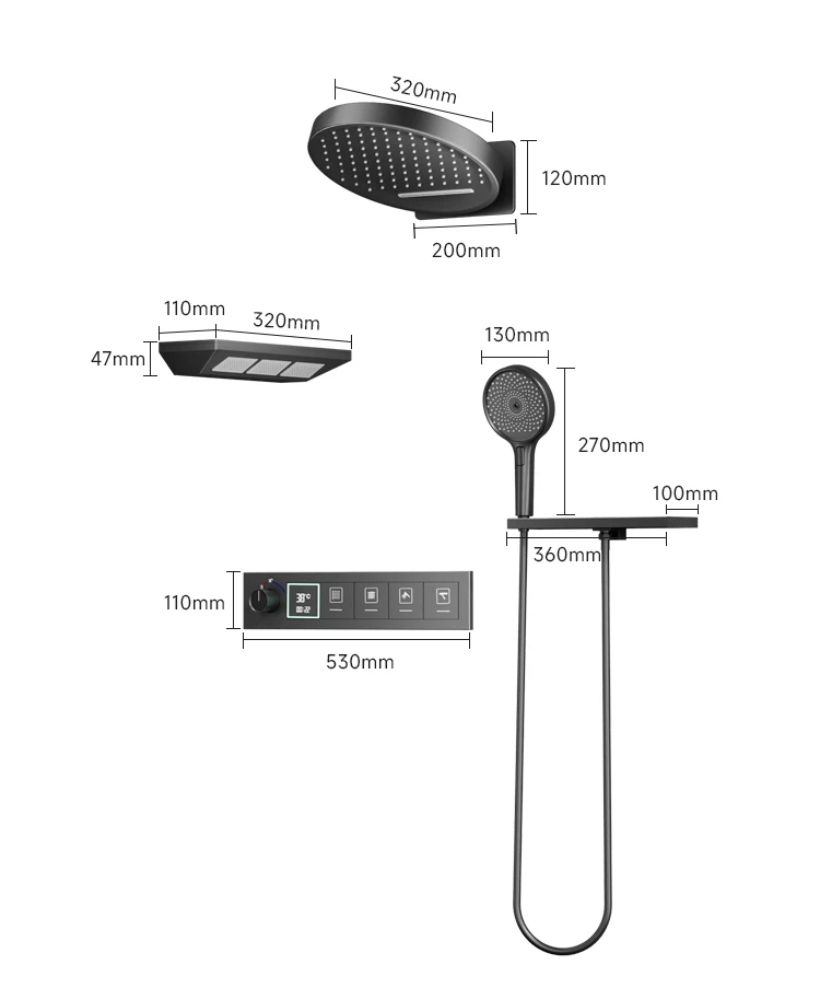 The solid brass thermostatic control unit ensures precise water temperature regulation,preventing sudden fuctuations for a safe, comfortable shower.The built-in digital display shows real-time water temperature,adding a sleek, high-tech touch.