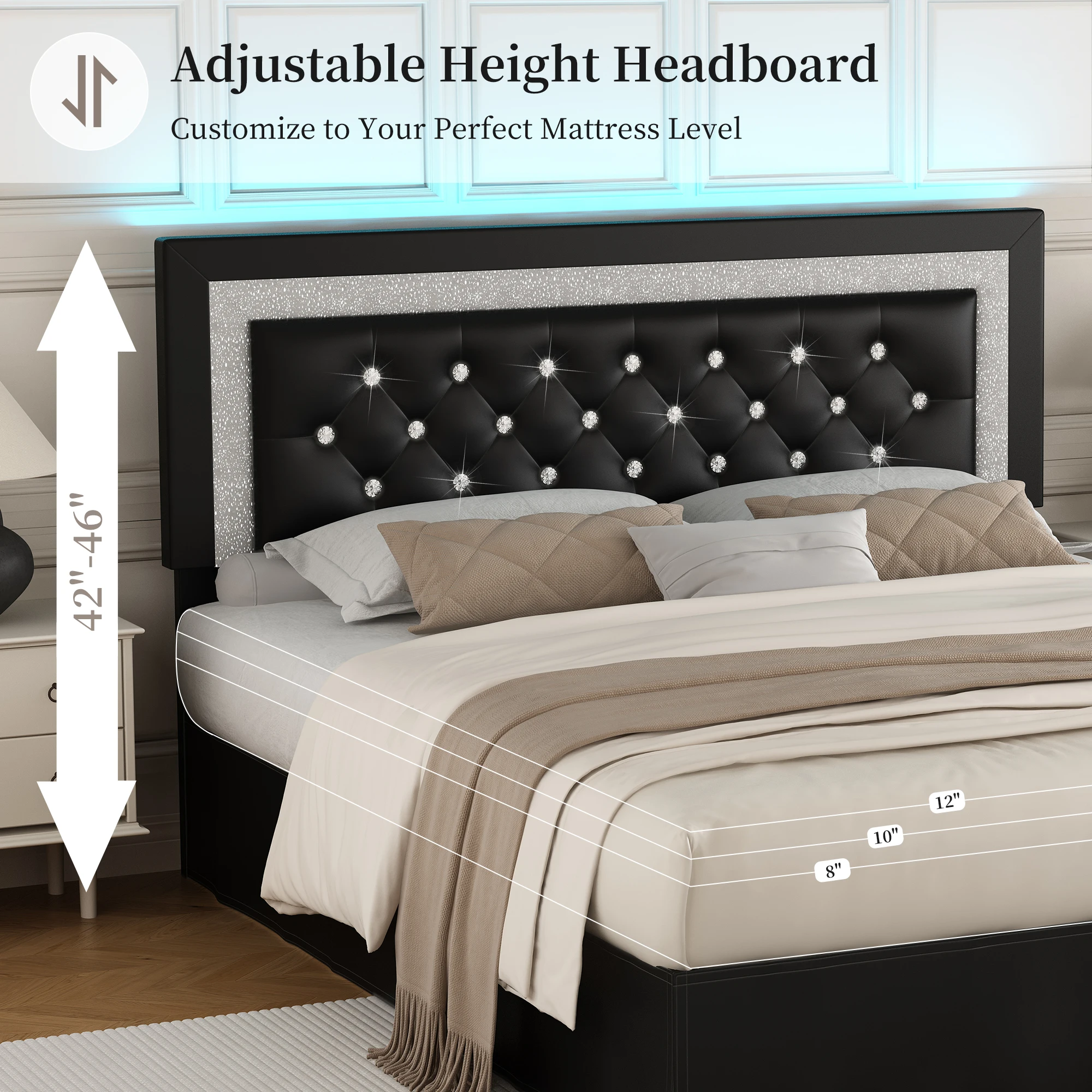 A: Yes, the headboard can be adjusted between 42" and 46" to accommodate different mattress heights (recommended 8"–12").